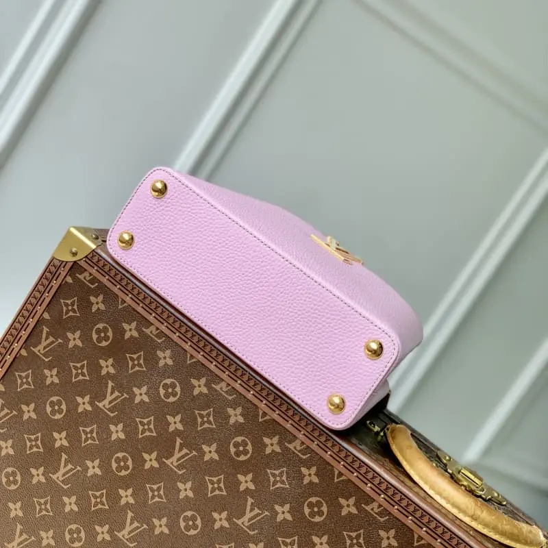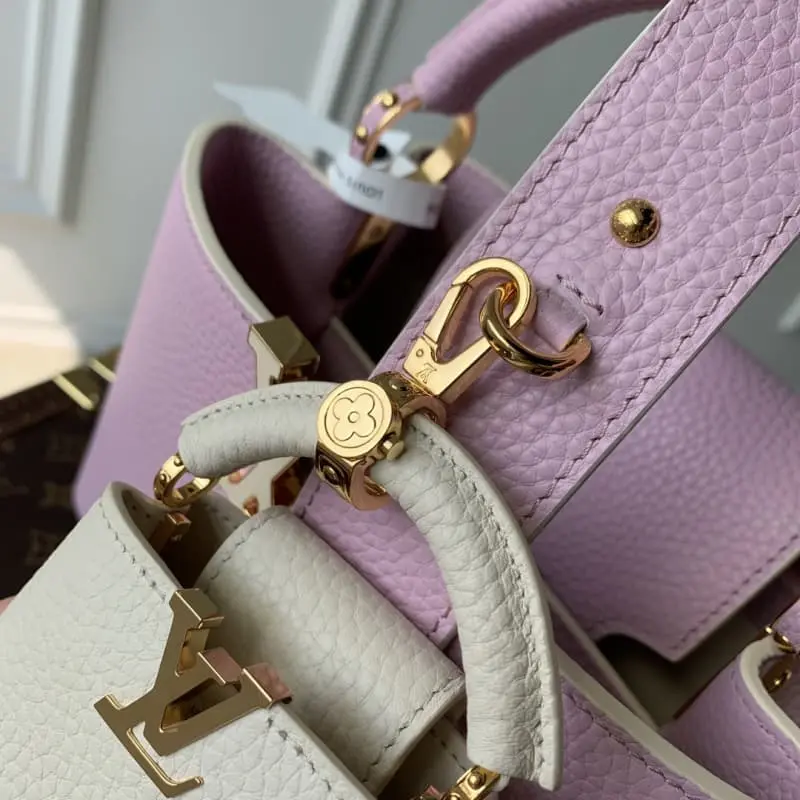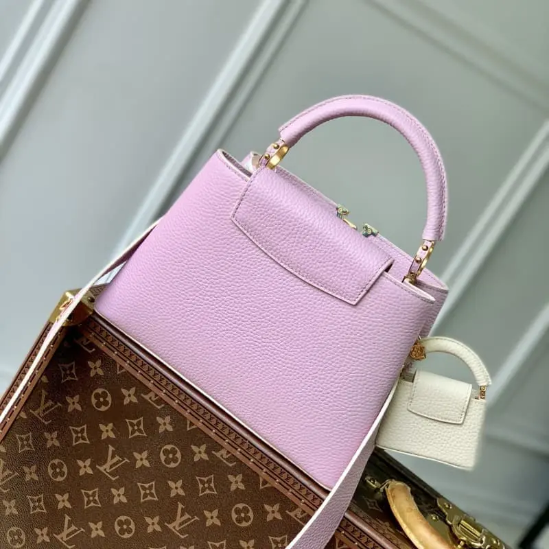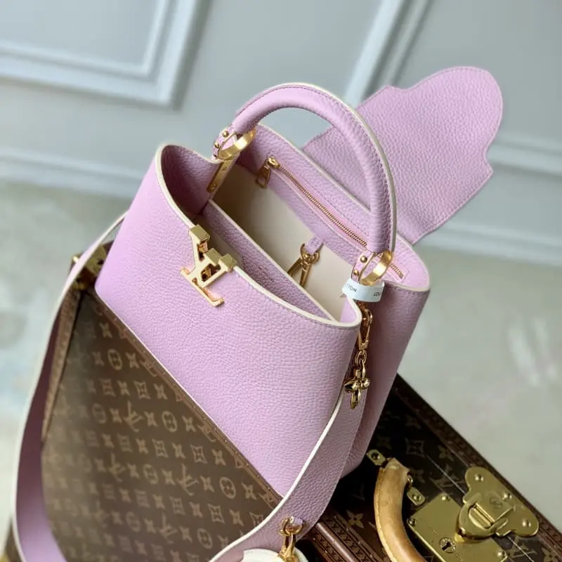 The pink Capucines BB bag M21420 returns in miniature this season. The mini Capucines Cutie decoration is fixed to the shoulder strap with a Monogram flower hook, showing charming charm and classic charm. The Taurillon leather body is decorated with jewel-like metal parts to store mobile phones, long wallets and other items. 26.5 x 17.5 x 9 cm (length x height x width)
