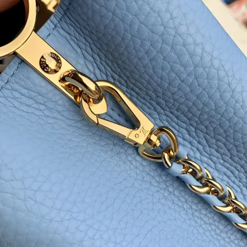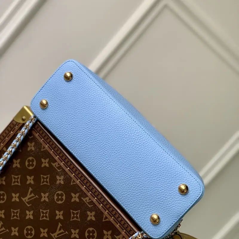 M21689 Blue This Capucines medium handbag is cleverly spliced with full-grain, lacquered, silky and textured cow leather, and the handles and flaps are wrapped with snake leather, just like a colorful fusion of makeup palettes. Delicate stitching hides the uneven edges to create another unique classic. Size 31 ?? 20 ?? 11cm