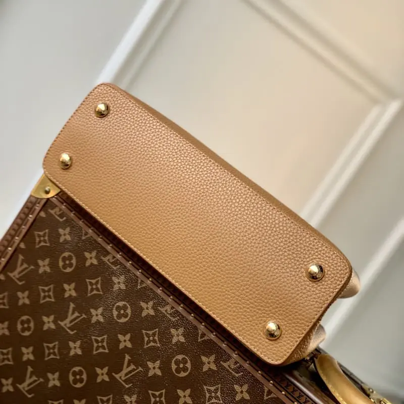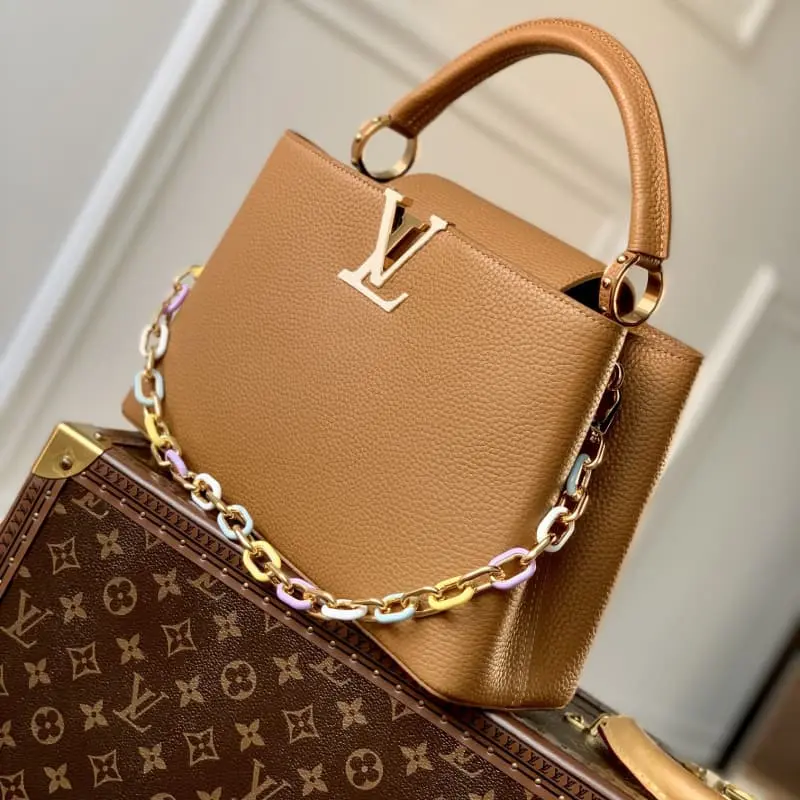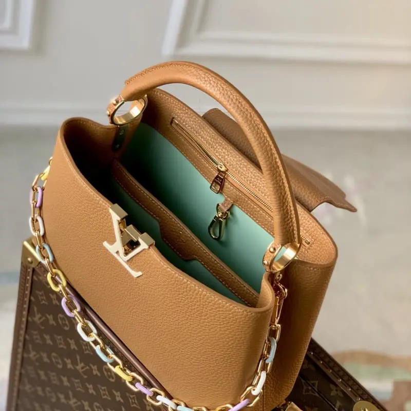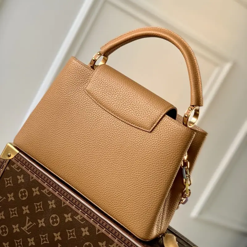 Top-grade original M21798 brown gold buckle This Capucines medium handbag interlocks metal and resin links to add fun to the classic design. Removable chain. Taurillon leather presents a lustrous look. Place the flap inside to show it off. LV logo style. Detailed features 31.5??20??11cm (length x height x width)