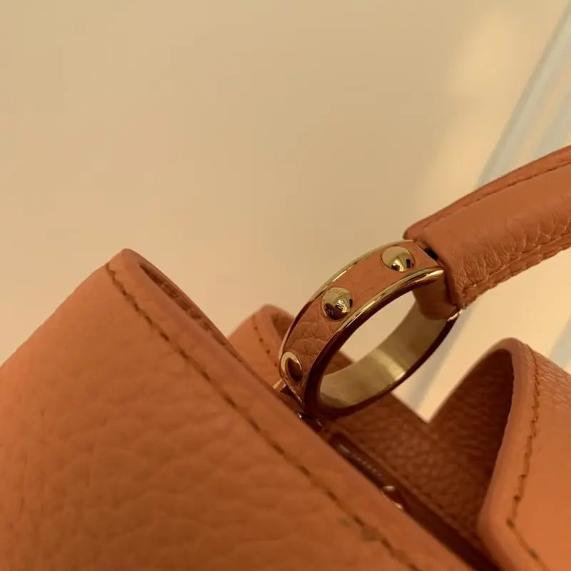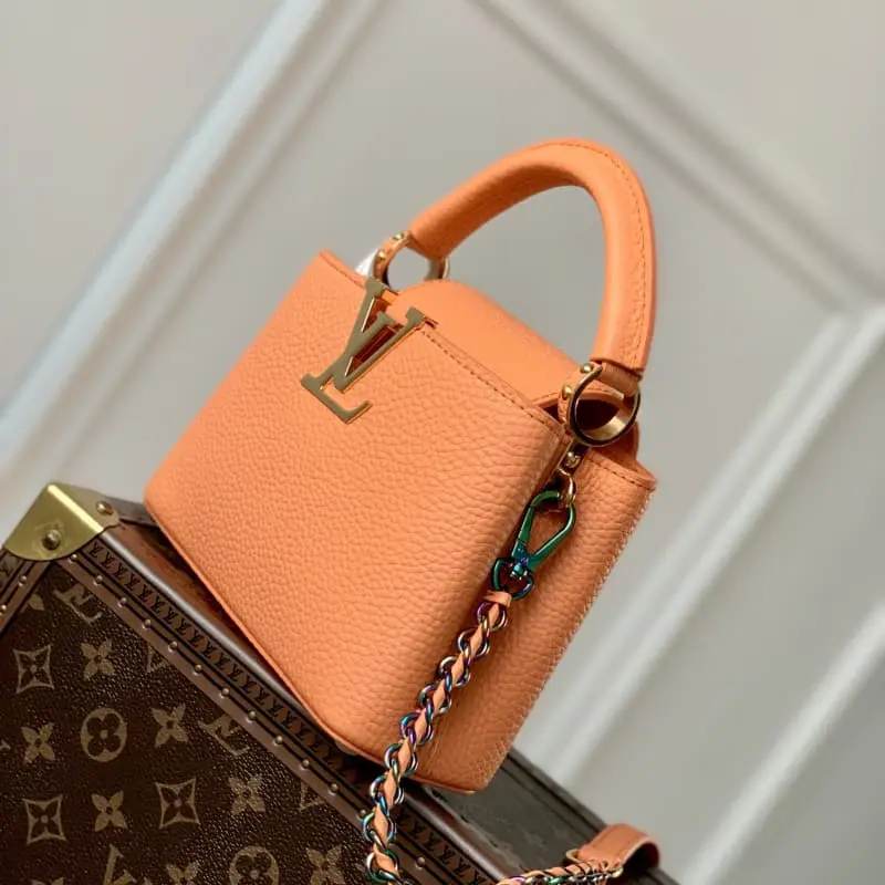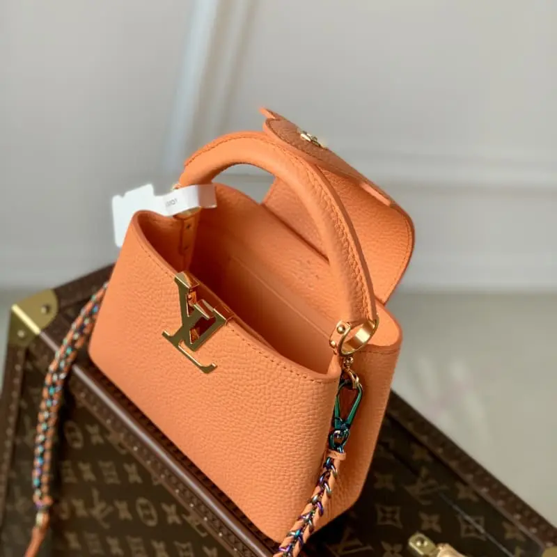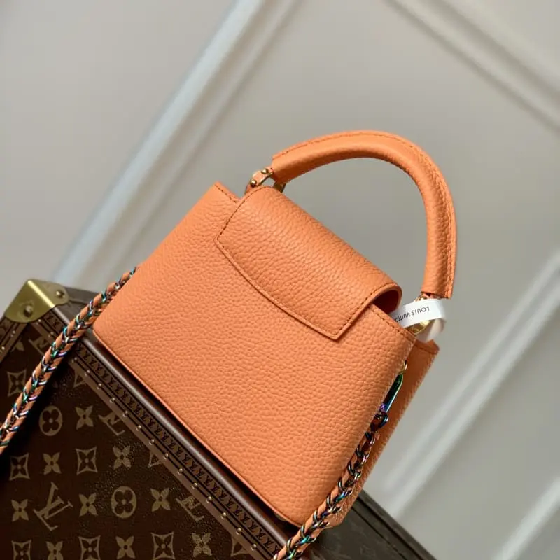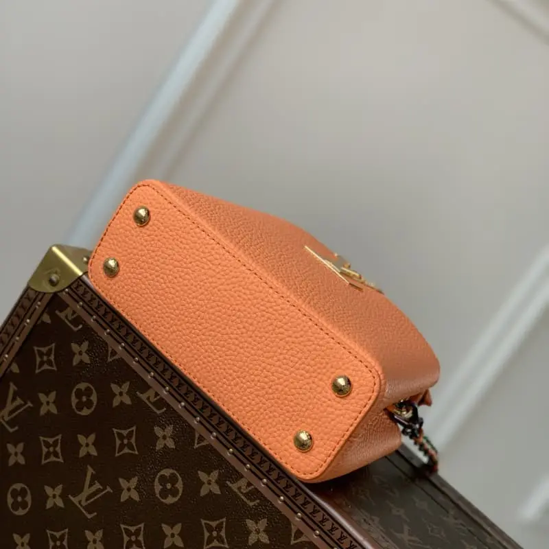 M22055 Coral Orange Mini This Capucines Mini handbag gives the LV letters and braided chain a colorful contrast with the simple and elegant style of the Taurillon leather bag. The jewelry-like handle rings and rivets continue the lustrous color and the metal parts add bright details. Size: 21??14??8cm (length x height x width)