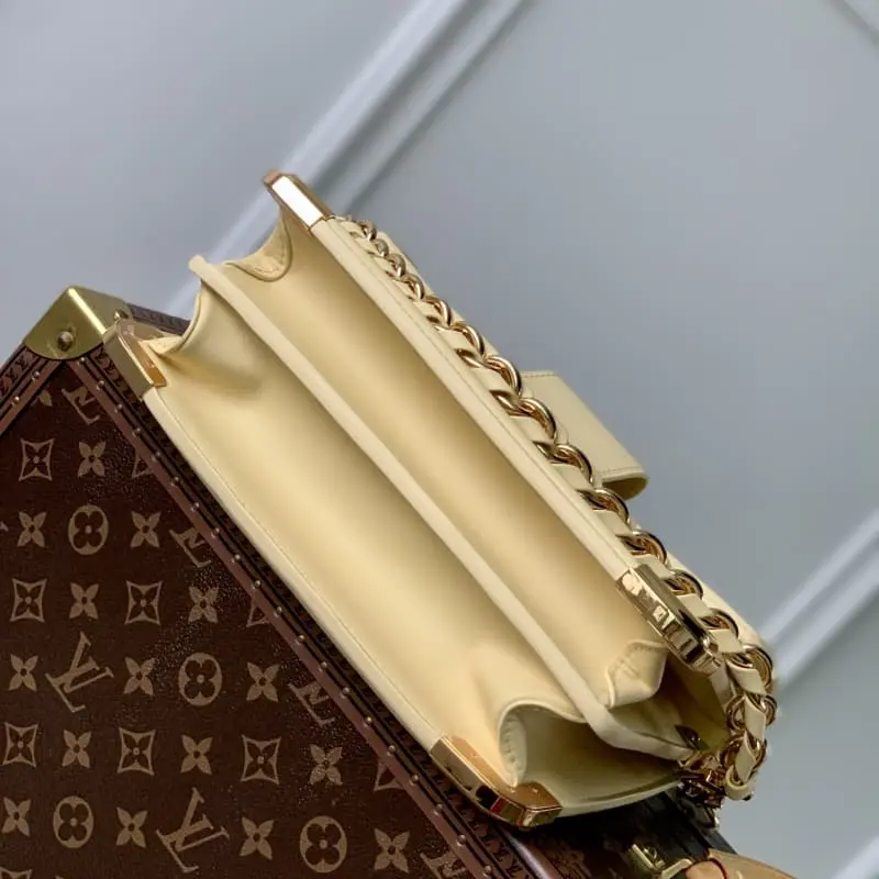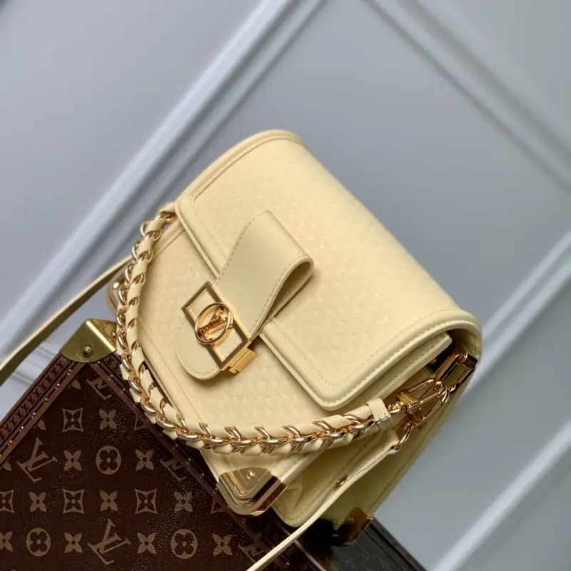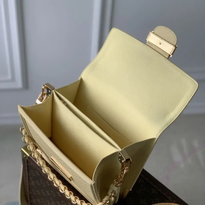 M22276 Yellow This Dauphine medium handbag is made of soft cowhide leather. The new mini version of the Monogram embossing creates a soft contrast with the body of the bag. The two inner compartments and the detachable braided leather chain strap are practical and suitable for daily carrying. The metal shiny corners and sharp brackets show Lbag’s box-making DNA. 25.0??17.0x 10.5 cm (length x height x width)