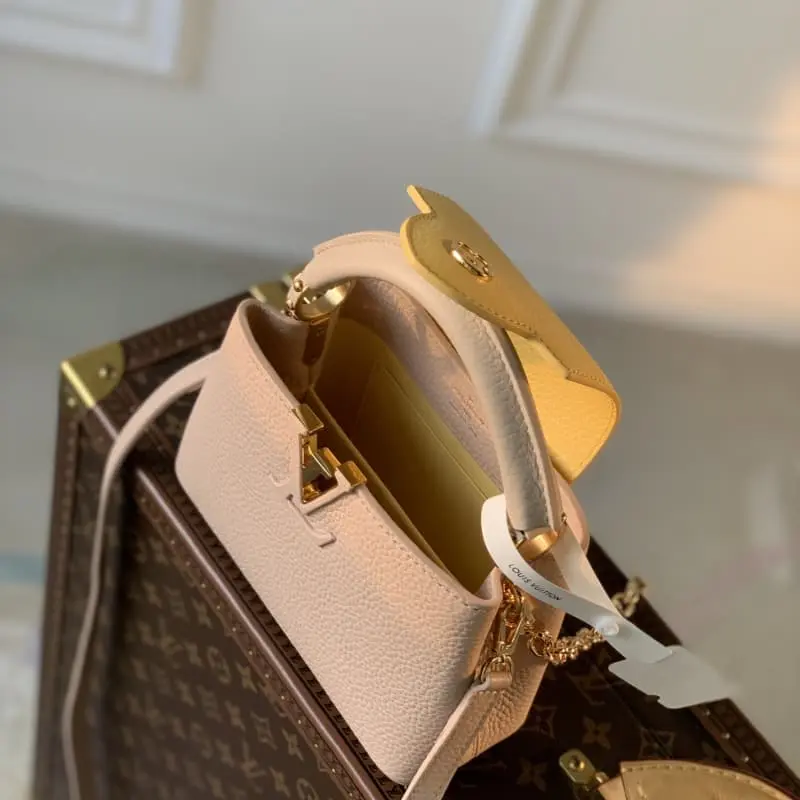 [Exclusive real shot of M22375 Almond Bag Mini] This Capucines mini handbag is dyed with soft colors to make the classic silhouette more eye-catching. The exquisite chain strung the metal Monogram flowers, each of which was molded, enamel-injected and hand-polished to sparkle brilliantly. The flap can be placed outside or retracted to show the LV logo. Size: 21x14x8cm
