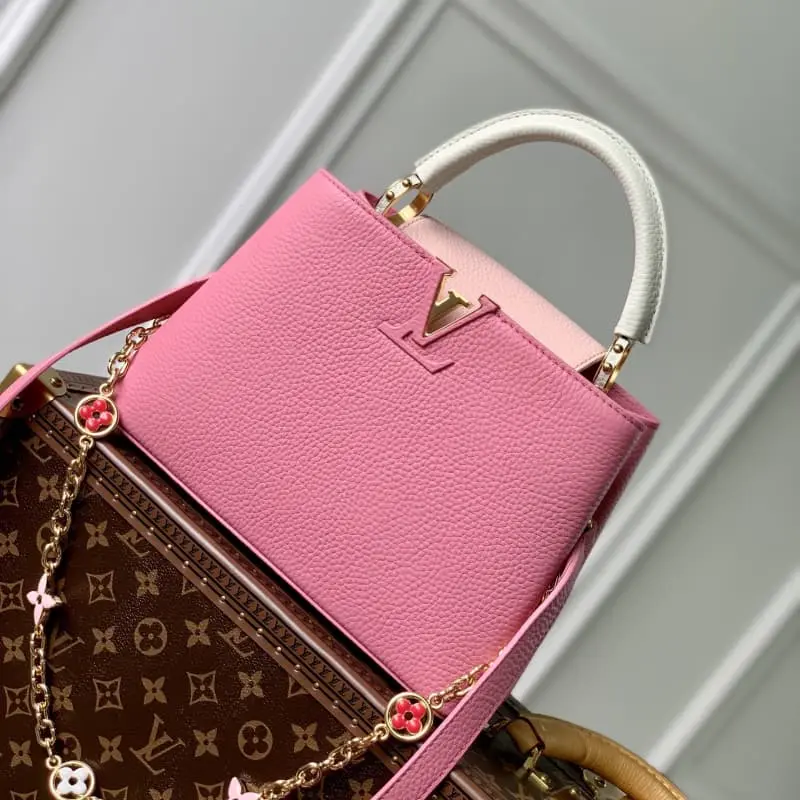 M22375 Pink This Capucines small bag is dyed with soft colors to make the classic silhouette more eye-catching. The delicate chain strung the metal Monogram flowers, each of which was molded, enamel-injected and hand-polished to shimmer brilliantly. The flap can be placed outside or retracted to show the LV logo. Detailed features 27??18??9 cm (length x height x width)