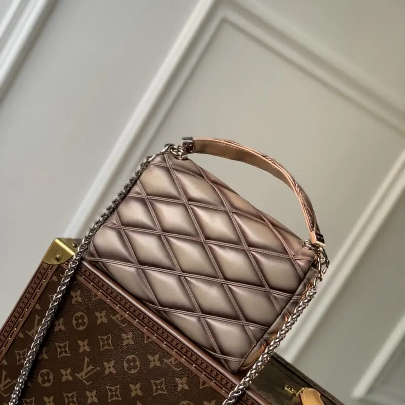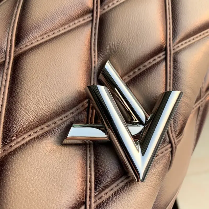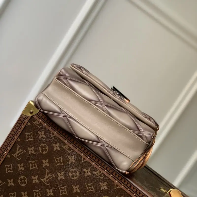 M22891 Silver Grey This GO-14 medium handbag is made of luxurious sheepskin leather with a quilted pattern that pays tribute to the brand’s traditional luggage design. LV Twist lock highlights the eye-catching style. The top handle can be carried alone or transformed into a sliding chain shoulder strap. The leather shoulder pad allows for a comfortable shoulder or crossbody experience. 23.0 x 16.0 x 10.0 cm (length x height x width)