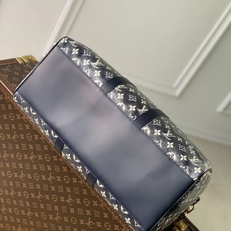 The blue keepallbandouli??re 45 travel bag M22923 is made of the seasonal monoglam fabric to create a striking shape. The fabric is made of monogram jacquard canvas woven with cotton and decorative thread, cut into a coated coating with a shimmering metallic luster. The holographic tone of the fabric changes colorful colors under the light, and the leather trim presents a three-dimensional sculptural texture. Size: 45*27*20cm