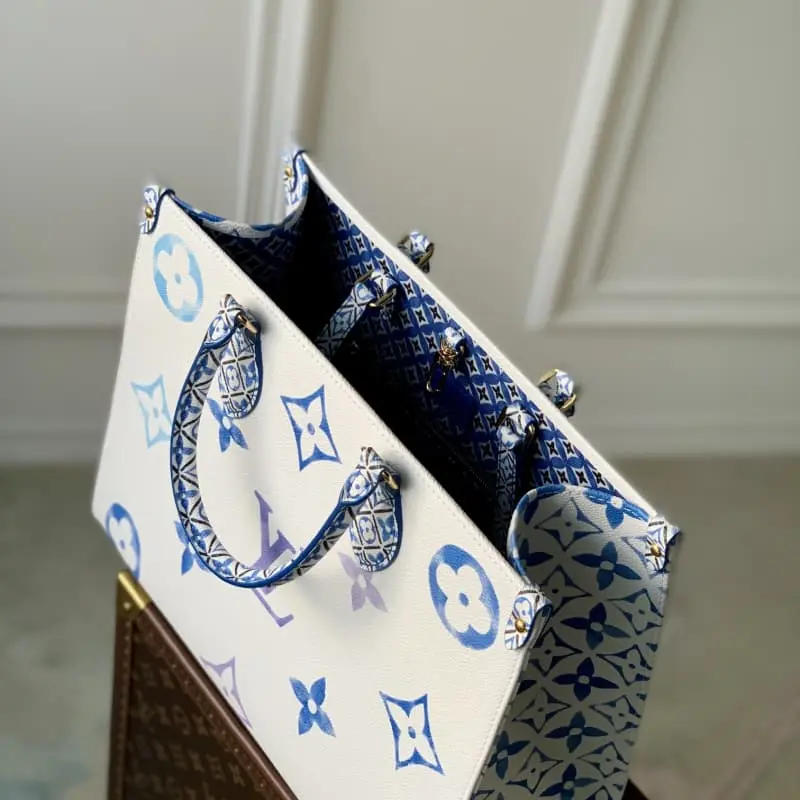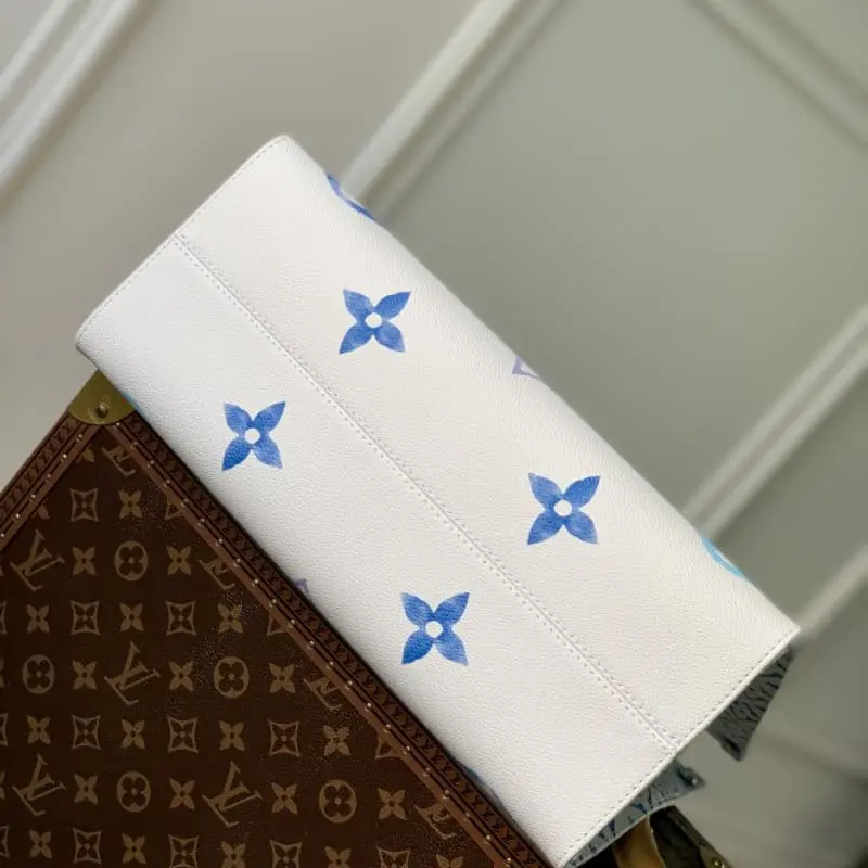 M22975 Blue Square Bag Diaper Bag Series Seasonal New ONTHEGO Medium Handbag This OnTheGo Medium Handbag is a coated canvas with a large Monogram pattern and intricate Monogram flowers on the trim and lining, inspired by traditional Portuguese tiles. Ample space combined with long and short handles makes it a great choice for daily travel. Detailed Features 35 x 27 x 14 cm (length x height x width)