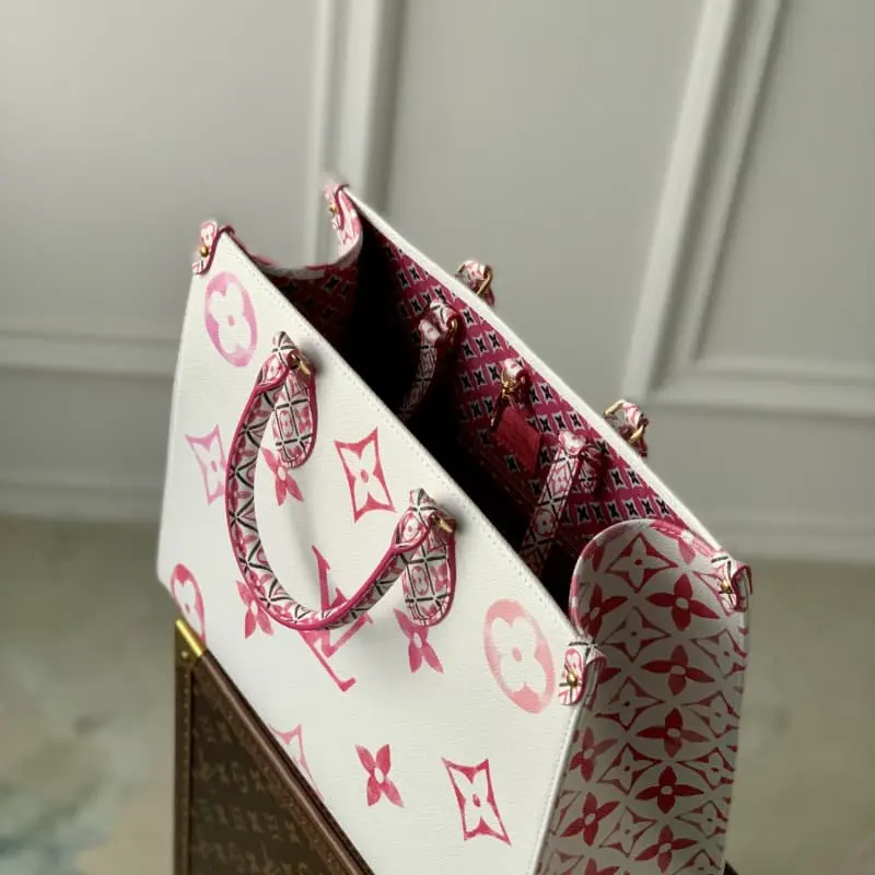 M22975 Pink Square Bag Diaper Bag Series New Season ONTHEGO Medium Handbag This OnTheGo Medium Handbag is a coated canvas with a large Monogram pattern and intricate Monogram flowers on the trim and lining, inspired by traditional Portuguese tiles. Ample space combined with long and short handles makes it a great choice for daily travel. Detailed Features 35 x 27 x 14 cm (length x height x width)