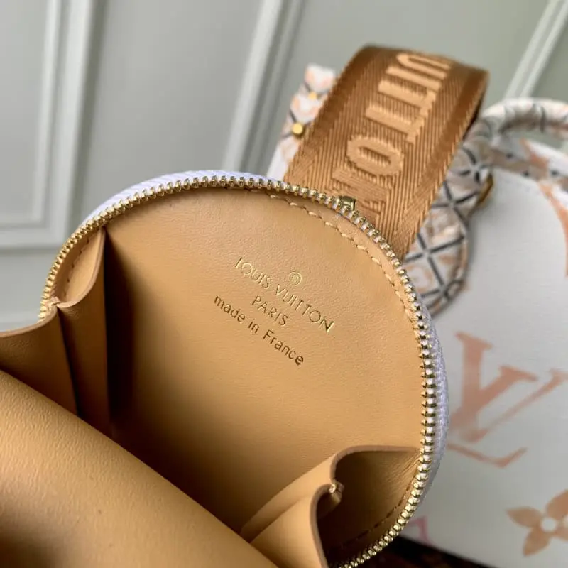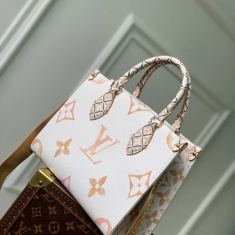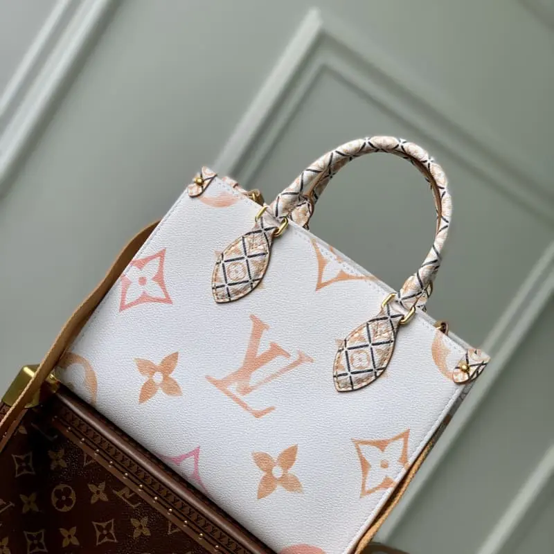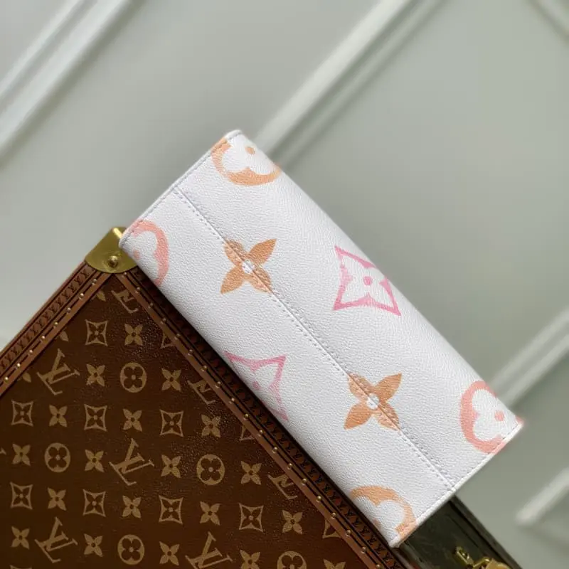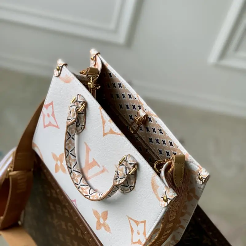 M22976 This OnTheGo small bag is made of canvas with a subtle Giant Monogram pattern on the trim and top handles. The fine Monogram flowers are inspired by traditional Portuguese tiles. The detachable and adjustable shoulder strap allows for a comfortable shoulder carry. Detailed Features 25 x 19 x 11.5 cm (length x height x width)