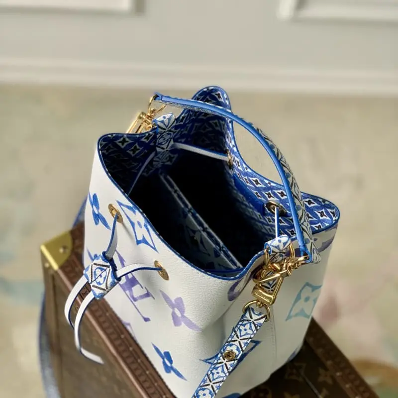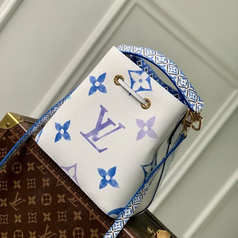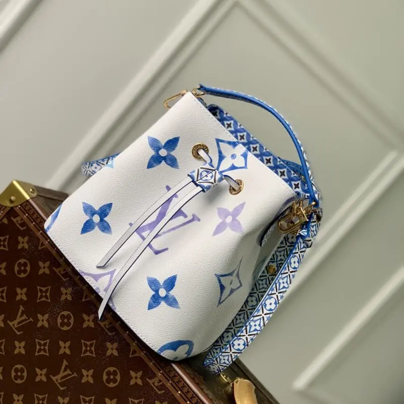 M22985 Blue Silkscreen This NeoNo?? bucket bag is made of light canvas with Giant Monogram prints, giving LV and Monogram flowers a watercolor effect of varying shades. It is paired with a drawstring and central snap pocket to exude a casual holiday vibe. Detailed Features 20 x 20 x 13 cm (length x height x width)