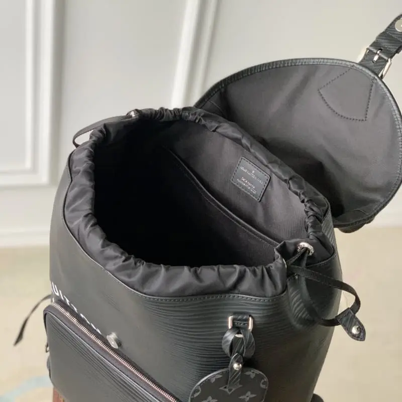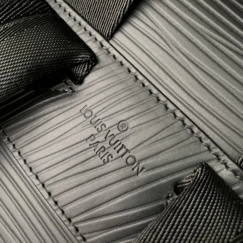 M23099 Black full leather water ripple backpack series Montsouris backpack made of cow leather presents an enlarged version of Epi leather embossing. Drawstring closure and zipper front pocket for convenient travel Lbag logo around the front pocket Removable name tag embellished with Monogram elements. Dimensions: 32.0 x 40.0 x 19.0 cm