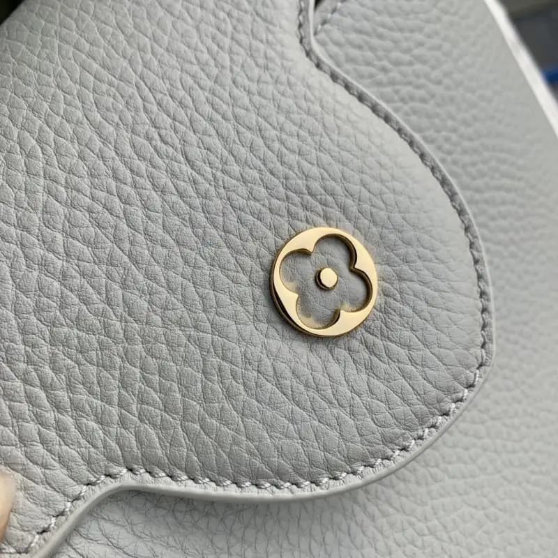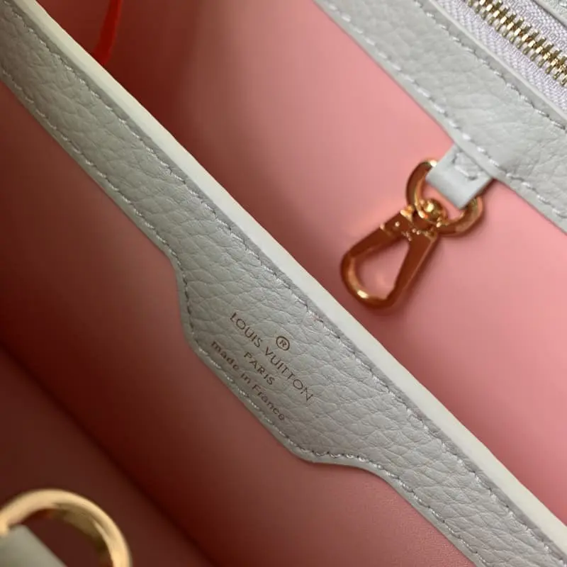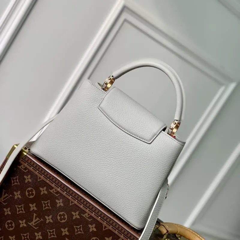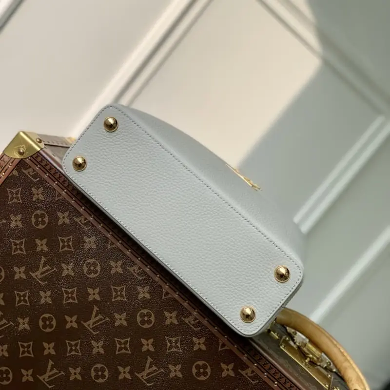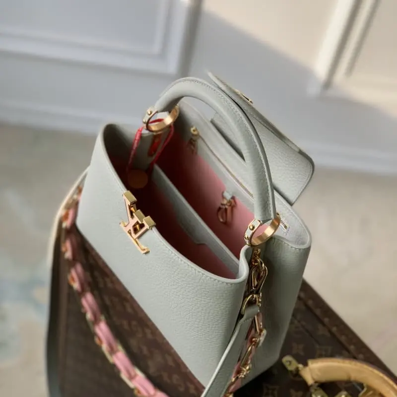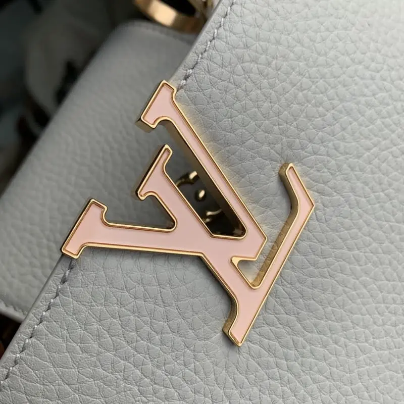 M23363 Grey Na Ying Series Capucines Medium Handbag M48865 This season’s new Capucines handbag highlights femininity Metal links and elegant soft cowhide leather are woven into exquisite chains with enamel and veneer Monogram Dhlo flowers scattered on them. The enamel brand logo highlights the jewelry texture and makes the handbag even more beautiful. Size: 21 x 14 x 8 cm