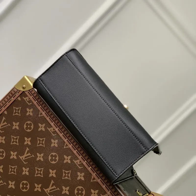 This Lock & Go bag is a stylish design with sophisticated details. Smooth grained cowhide leather is embellished with LV turn buckle, inscribed rivets and hot stamped Lbag logo. The top handle and adjustable and detachable shoulder strap make it comfortable to carry on the shoulder or crossbody for daily use. 24.5 x 19.0 x 10.5 cm (length x height x width)