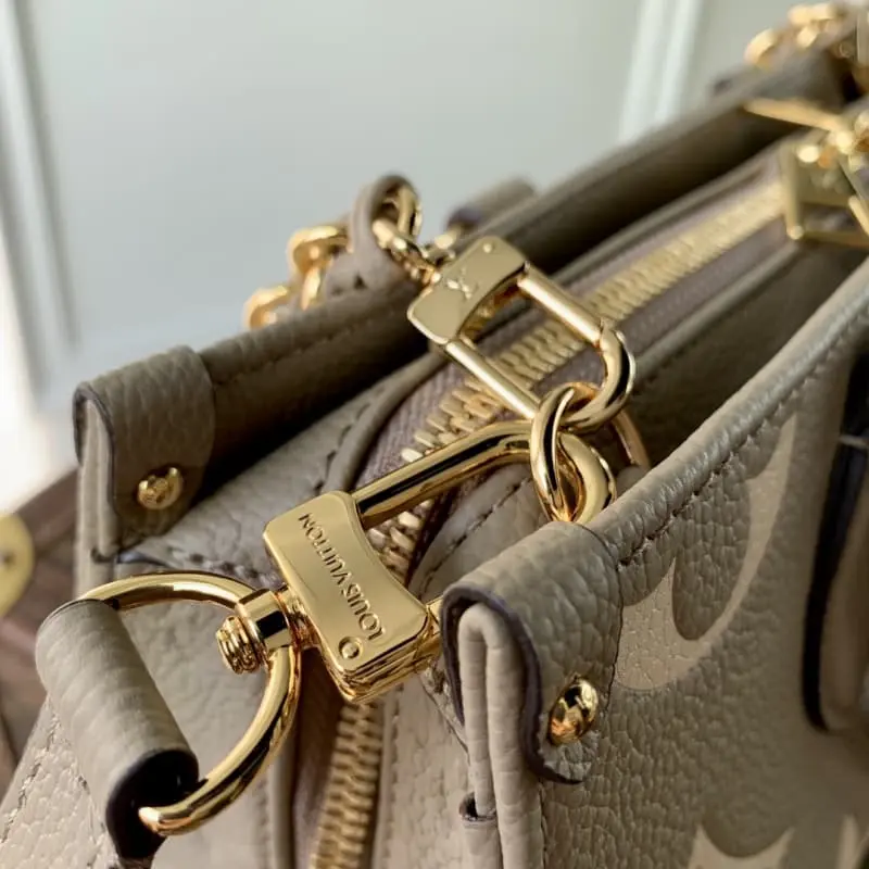 M23641 This OnTheGo small handbag is made of Monogram Empreinte leather. The Giant Monogram pattern highlights the soft and slender silhouette. The compact interior space can organize daily necessities. The articulated top handle and detachable leather braided chain shoulder strap provide a variety of carrying options. 25.0 x 13.0 x 10.0 cm (length x height x width)