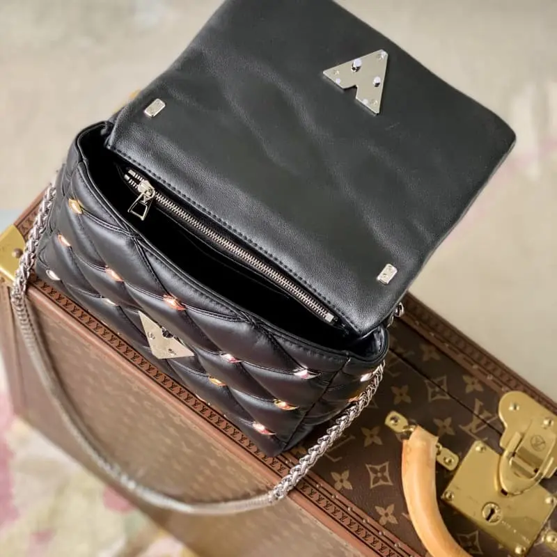 M24151 Black This GO-14 medium handbag is quilted sheepskin with a striking Malletage pattern that once again confirms the brand’s exquisite craftsmanship. The exquisite metal studs and LV Twist lock shine brightly. The detachable handle and adjustable sliding chain expand the carrying method. 23 x 16 x 10 cm (length x height x width)