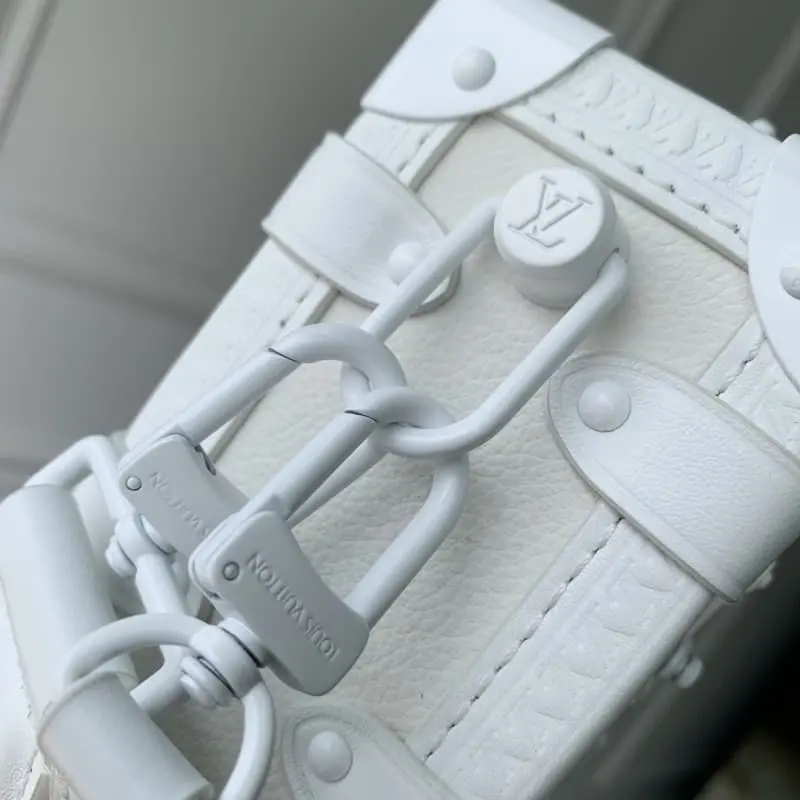 M24304 White This Side Trunk small bag is from the Black Out collection. It pays tribute to Lbag’s vintage travel trunks with grained leather. The iconic S-lock clasp and reinforced metal corners continue the plain tones. The handle and adjustable shoulder strap are convenient for hand-carrying, shoulder or crossbody. Both are detachable. 12.5 x 8 x 18 cm (H x W x L)