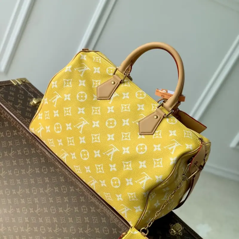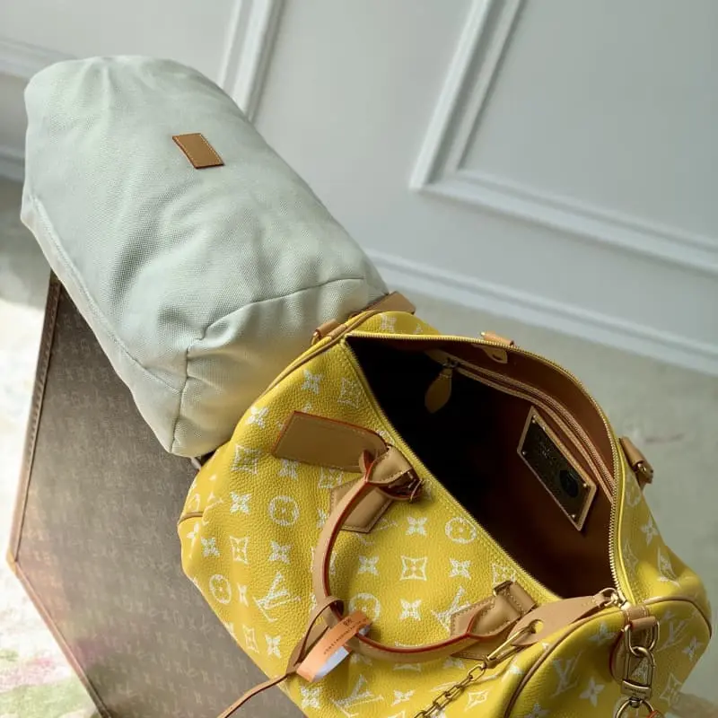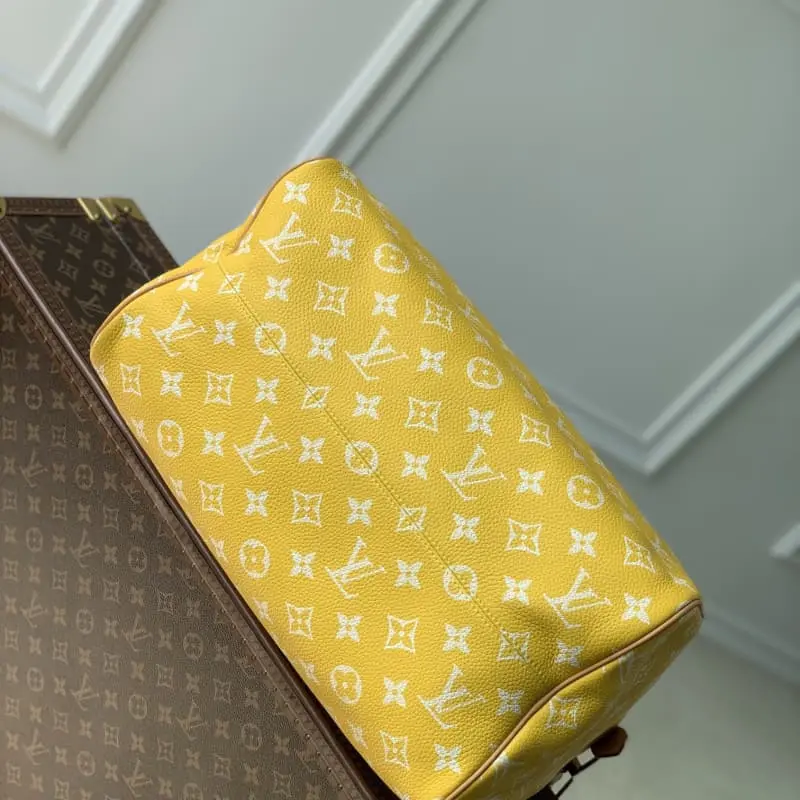 M24419 Yellow This Speedy P9 Bandouli??re 40 Monogram Leather handbag is made of soft grained cow leather wrapped with sheep leather lining. The silk-screened Monogram pattern presents the blurred look of canvas print, which shows the creative director Pharrell Williams’s new season ingenuity. 40 x 26 x 23 cm (length x height x width)