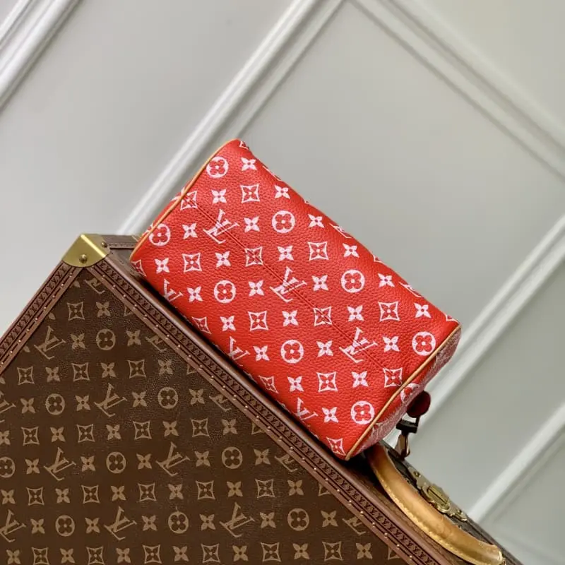 M24425 Red This Speedy P9 Bandouli??re 25 Monogram Leather handbag uses soft cowhide leather to reproduce the elegant look of canvas print with Monogram pattern. The dazzling metal parts, sheepskin lining and nameplate together confirm the creative director Pharrell Williams’s unremitting pursuit of details. 25 x 15 x 15 cm (length x height x width)
