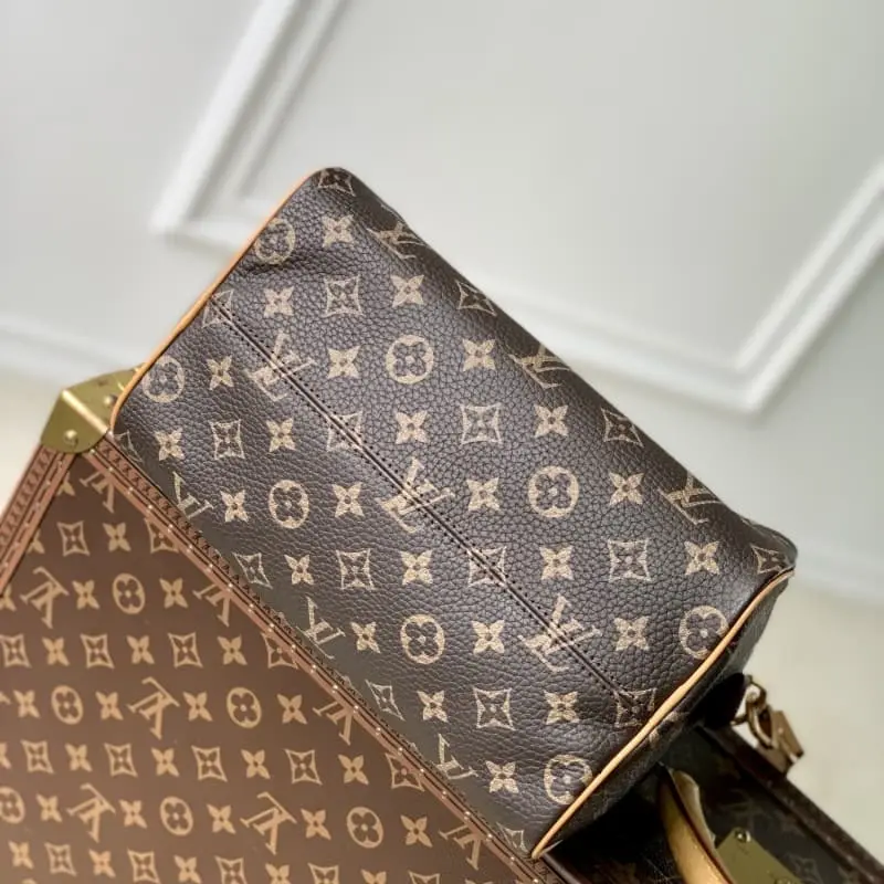 M24443 Monogram Speedy P9 Bandouli??re 25 Monogram Leather Handbag This model uses soft cowhide leather to reproduce the elegant look of canvas print with Monogram pattern. The dazzling metal parts, sheepskin lining and nameplate together confirm the creative director Pharrell Williams’s unremitting pursuit of details. 25 x 15 x 15 cm (length x height x width)