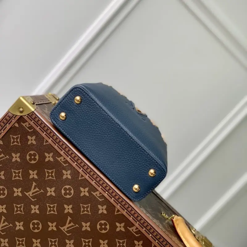 M24567 Blue Mini Capucines Mini Handbag French imported calfskin, shiny metal accessories, unique Capucines flap can be put inside the bag to display the letter logo, or turned out to show the Monogram Flower pattern size: 21x14x8 cm