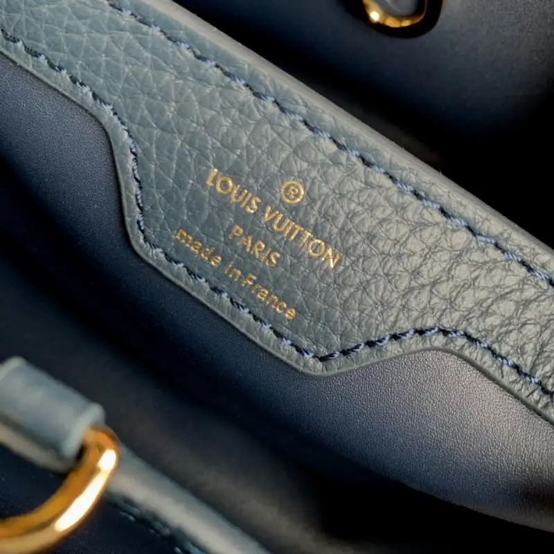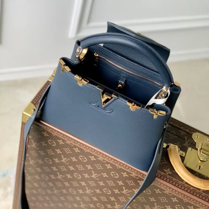 M24567 Blue Small Capucines BB Handbag French imported calfskin, shiny metal accessories, unique Capucines flap can be put inside the bag to display the letter logo, and can be turned out to show the Monogram Flower pattern size: 27 x 18 x 9cm