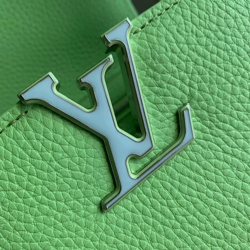 M24683 Small Capucines Small Handbag This model is made of bright Taurillon leather. The octagonal links of the delicate chain are inlaid with colorful enamel to illustrate the design concept of Art Deco. The 3D LV letters add a fresh touch. 27 x 18 x 9 cm (length x height x width)
