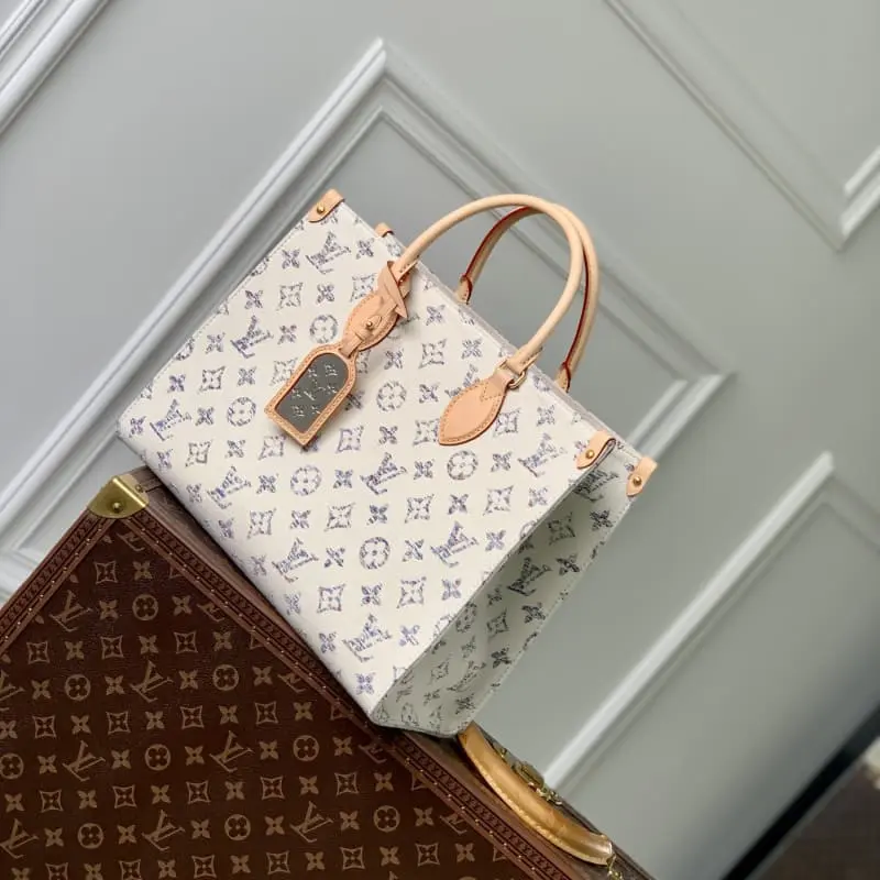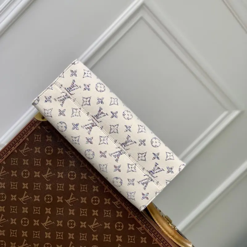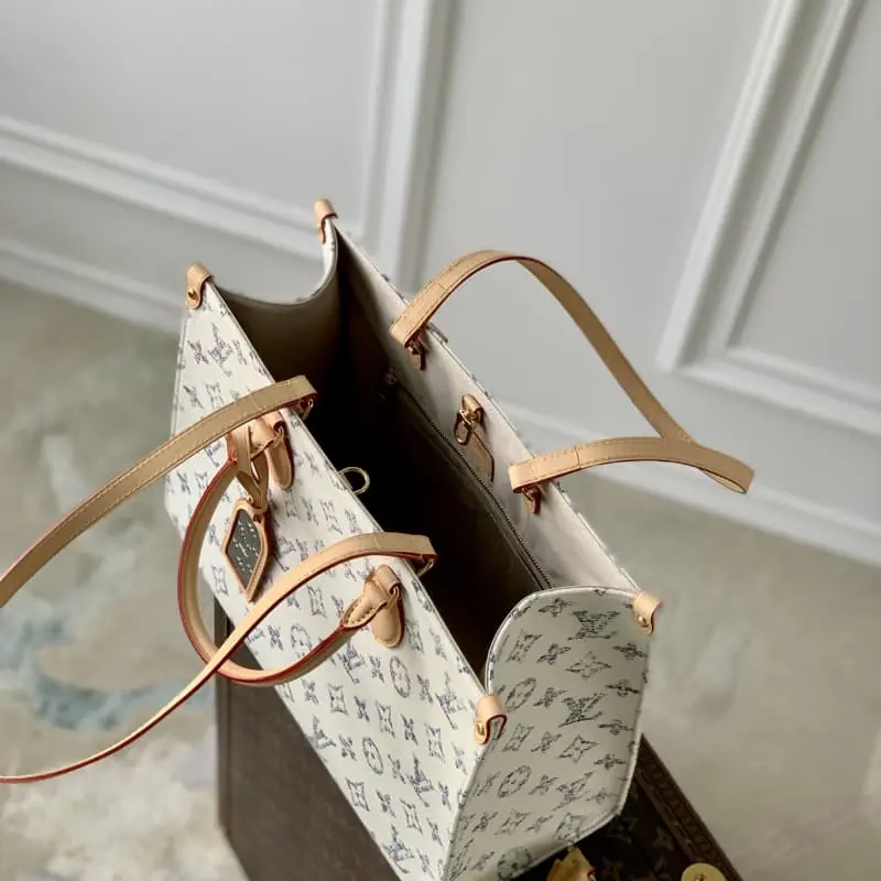 M24708 White Denim Square Bag Diaper Bag Collection OnTheGo MM Handbags Nautical Collection This OnTheGo MM is part of the Nautical capsule Made from Monogram Zph jacquard fabric Made from 66 different colored threads Monogram with soft color gradient. To ensure durability the fabric is treated with an invisible protective coating. Each model comes with a laser engraved mirror charm for touch-ups on the go. Dimensions: 35??27??14 cm
