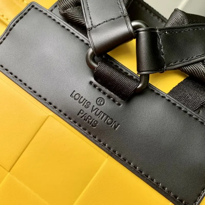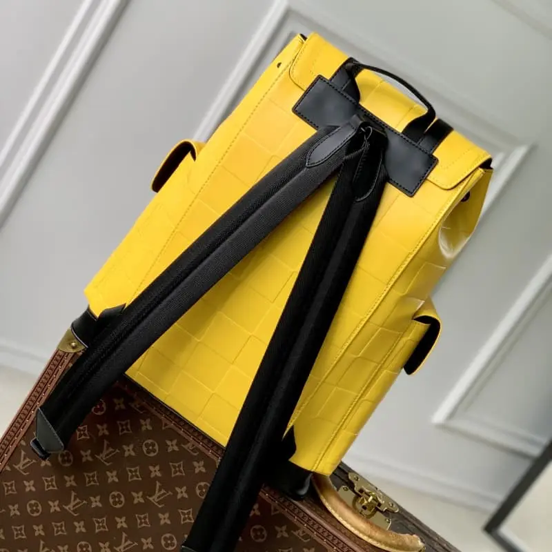 M25016 This medium Christopher backpack is made of Damier Scuba leather by Pharrell Williams in bright tones to create a dynamic and energetic look. Leather trims and hardware highlight the eye-catching Damier embossing. Spacious side pockets, snaps and drawstring elements continue the classic mountaineering bag design. 44 x 12.5 x 38 cm (H x W x L)