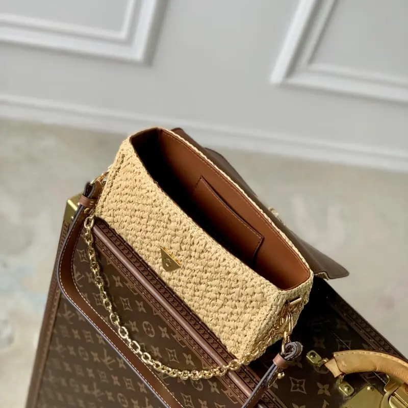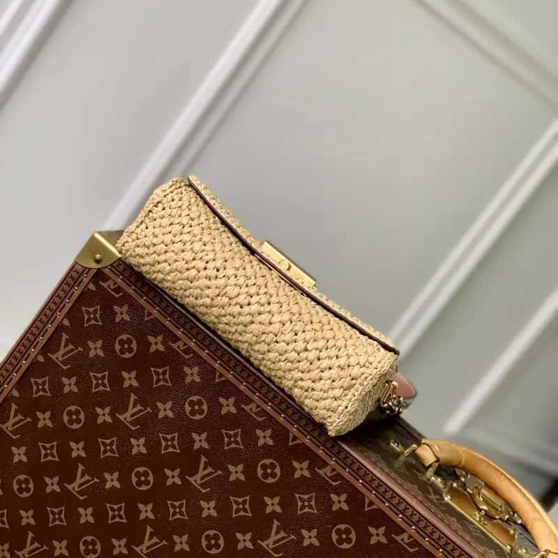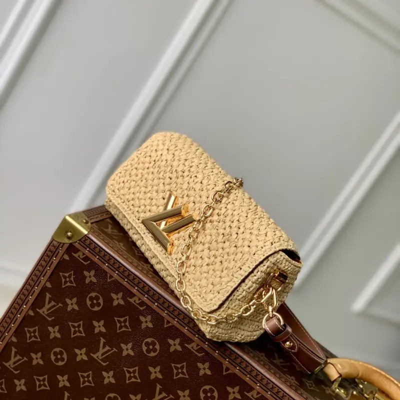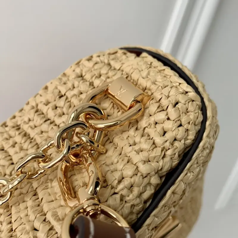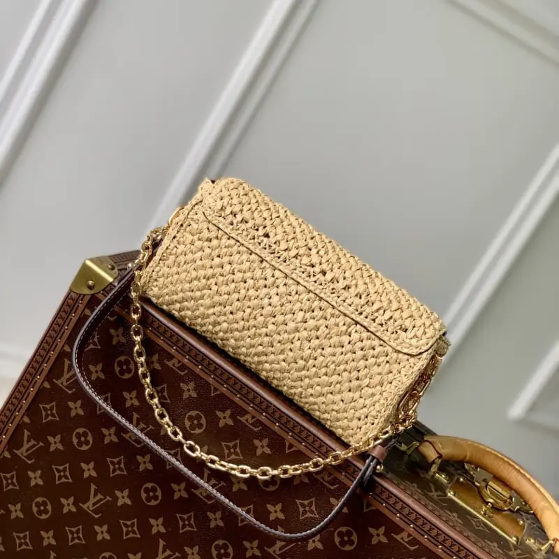 M25030 This Twist West bag in woven rattan with smooth calfskin trim is part of the LV By The Pool collection. This summer version of this elegant bag features a gold LV Twist lock. The chain, also in gold, can be used as a decorative detail or attached to the shoulder strap for added drape. 23.5 ?? 12 ?? 7cm (length x height x width)