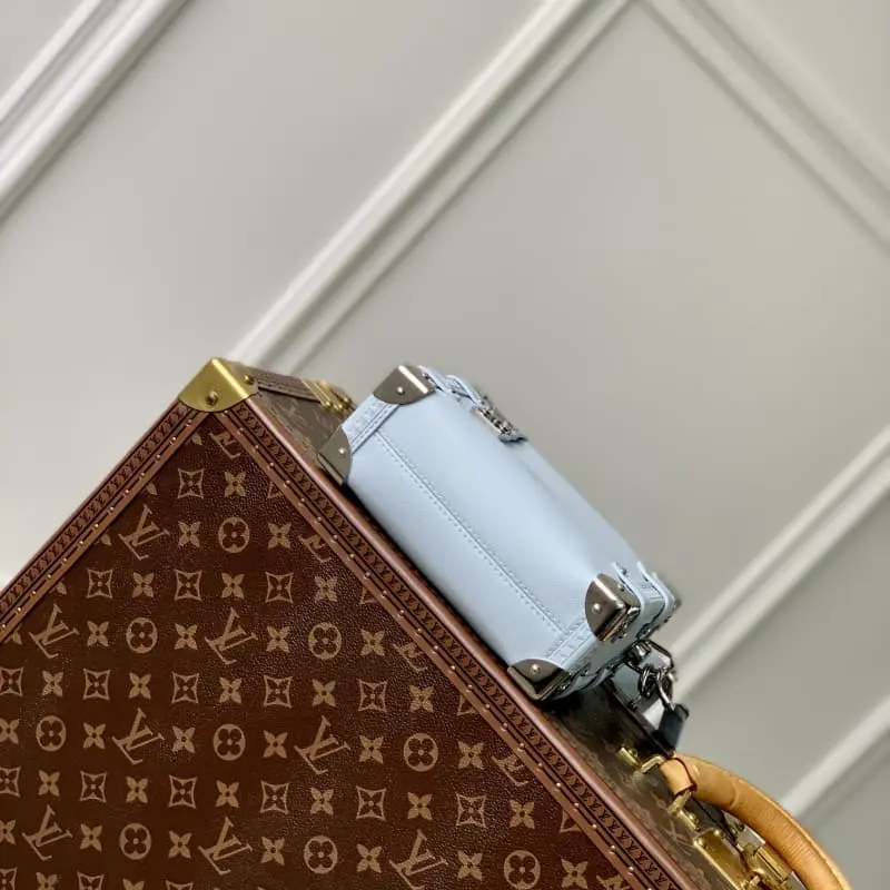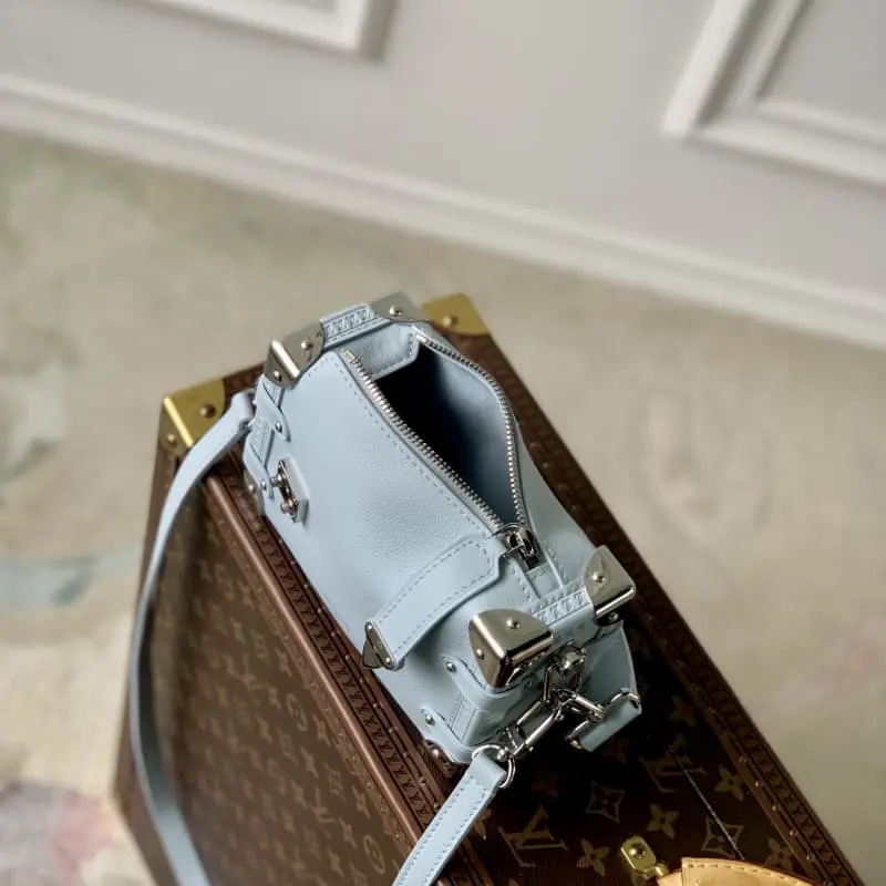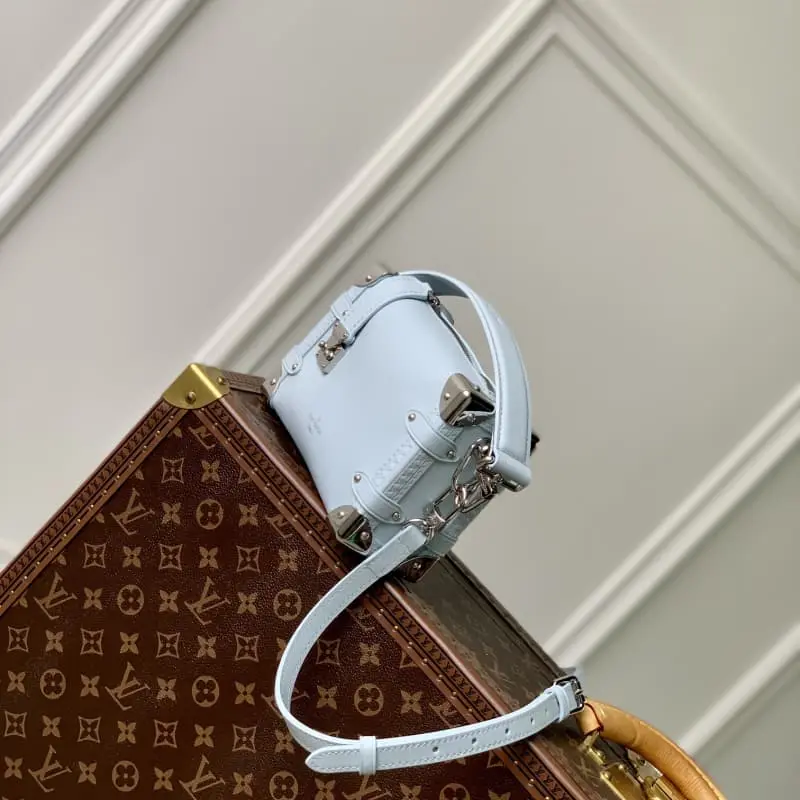 M25067 Light Blue This Side Trunk Small Bag is made of grained cowhide leather with S-lock clasp and corners, which is inspired by the brand’s traditional hard cases. The leather handle and adjustable leather shoulder strap are both detachable and provide a variety of carrying methods. It can accommodate a wallet, large smartphone, keys and lipstick. 18 x 12.5 x 8 cm (length x height x width)