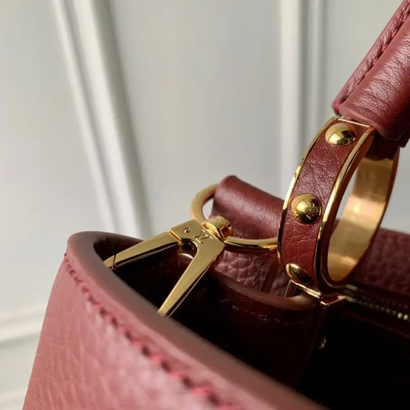 M25128 Small size in fuchsia This Capucines mini bag reveals the subtle luster of fine Taurillon leather and is embellished with the iconic LV letters. The removable wide shoulder strap allows the compact size to be carried on the shoulder or crossbody. 27 x 18 x 9 cm (length x height x width)