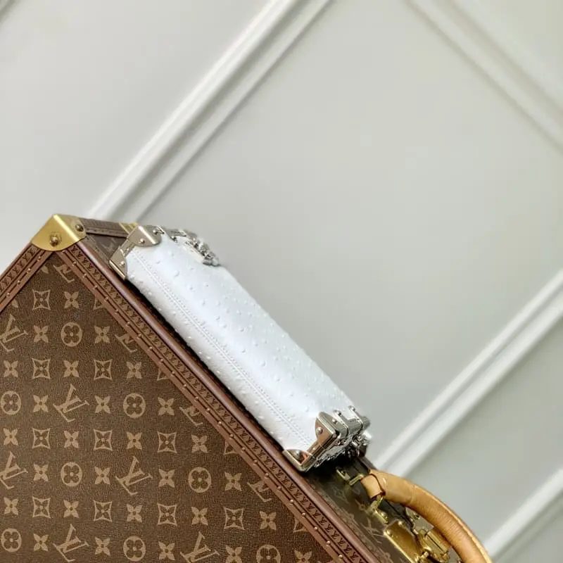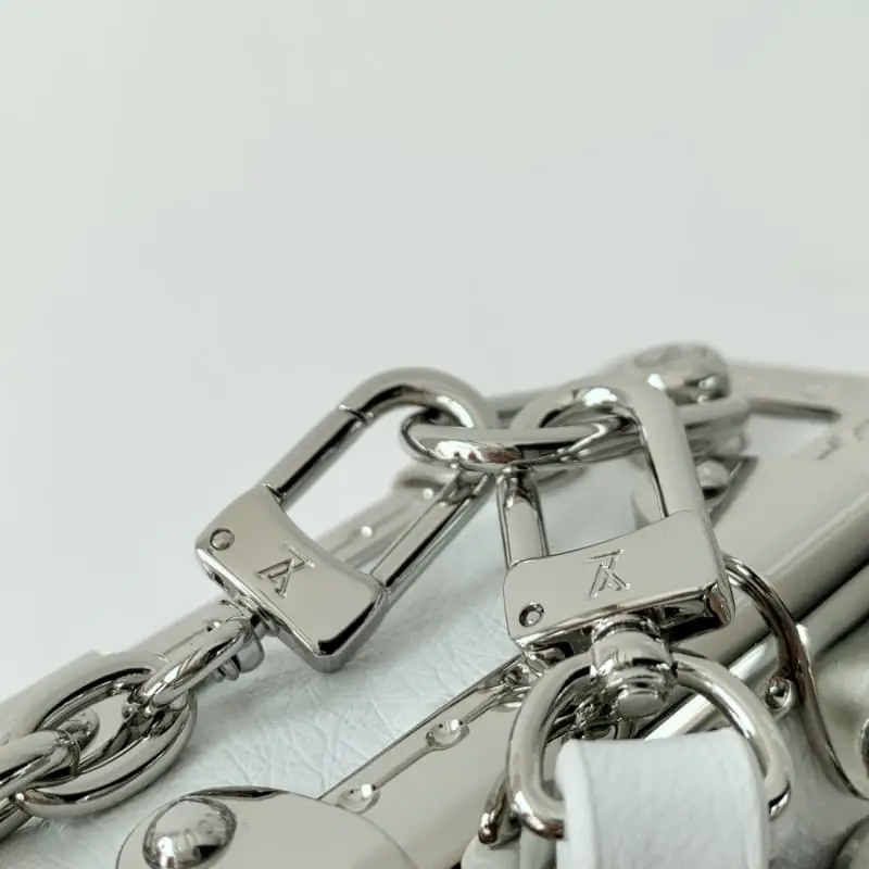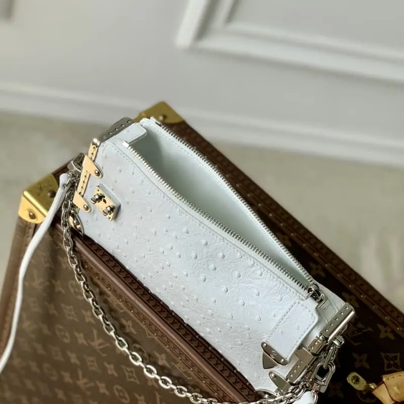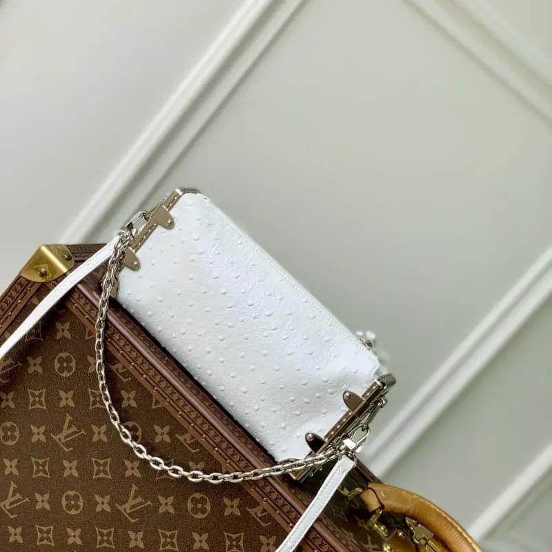 M25445 White Ostrich Pattern This Slim Trunk handbag draws inspiration from Lbag’s traditional hard cases. The soft cowhide leather is combined with rivet frames and metal S-lock buckle to highlight the avant-garde rock style. The shiny chain and adjustable leather shoulder strap are both detachable to provide a variety of carrying options. 23 x 12 x 4 cm (length x height x width)