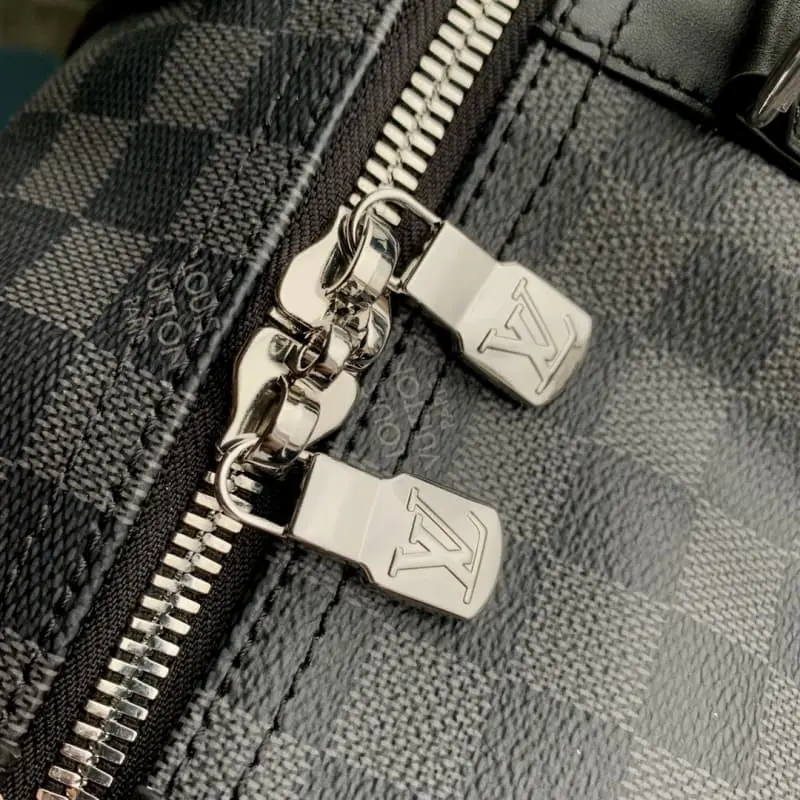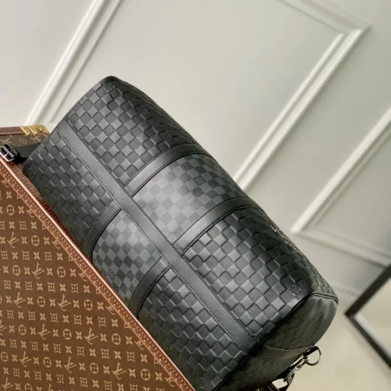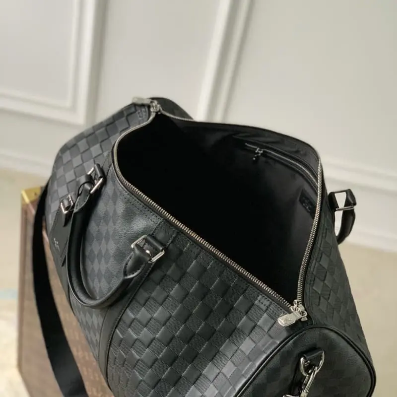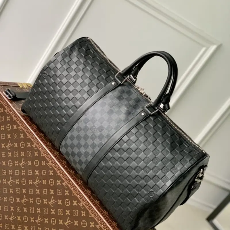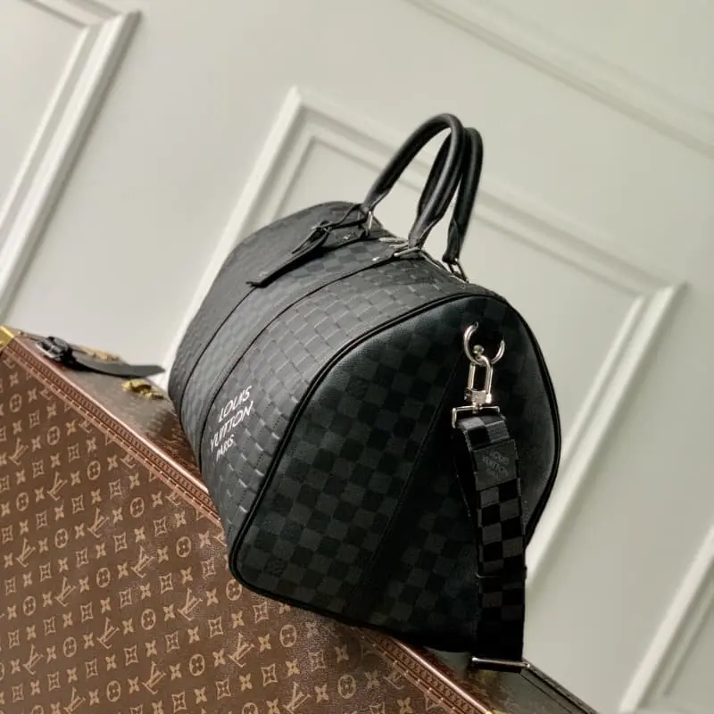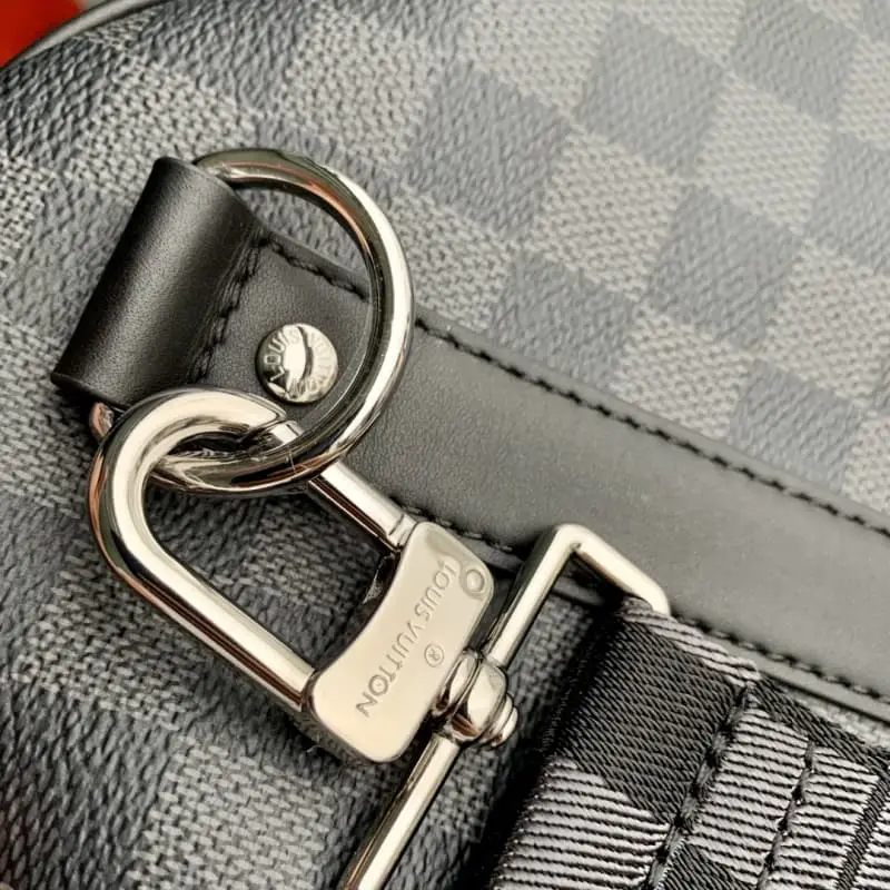 M40443 The Keepall Bandouli??re 50 travel bag embodies masculine style. Damier Infini leather is embossed with a classic checkerboard pattern and paired with Damier Graphite coated canvas. The bag features leather side straps, top handles and a luggage tag, and is embellished with the italic ‘Lbag Paris’ signature to complete this chic and elegant design. Product Information 50 x 29 x 23 cm