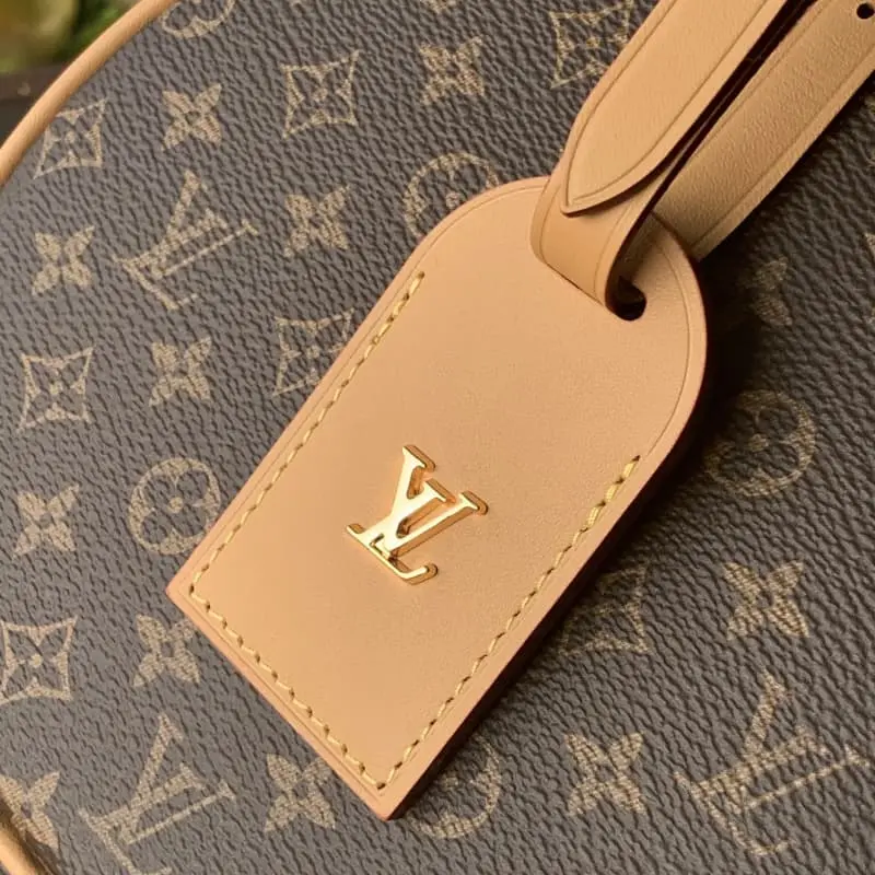 M43514 Yellow Leather PETITE BOITE CHAPEAU Handbag Monogram coated canvas – Natural leather trim – Lambskin lining – Gold metal trim – Adjustable leather handle on top – Removable and adjustable leather strap – Removable leather ID holder – 4 protective metal studs Size 17.5X16.5X7.5cm