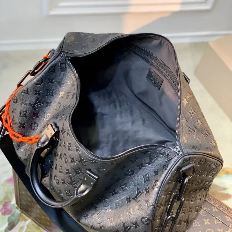 M44470 Full leather embossed This Keepall is made of soft Taurillon leather. The elegant black hue is embellished with the brand’s traditional Monogram embossed pattern. Minimalist design with matte metal parts. Cabin luggage size is perfect for short trips. Dimensions: 50 ?? 29 ?? 22 cm.