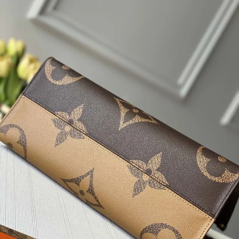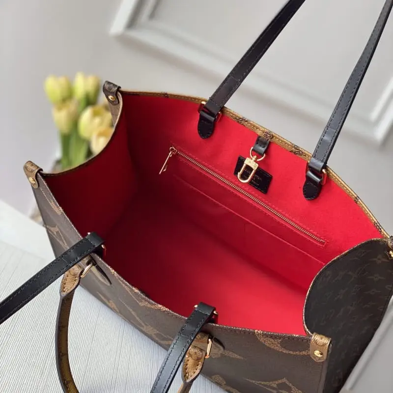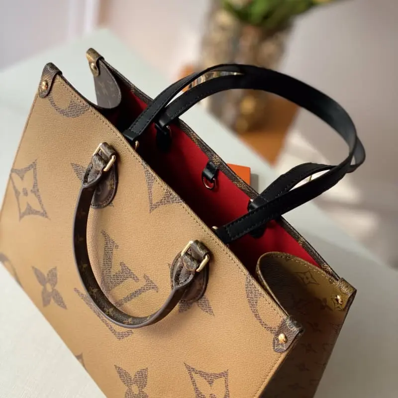 The M45321 Onthego medium handbag features classic Monogram canvas and Monogram Reverse canvas on both sides, showing different styles at will. The Toron double handles and shoulder strap allow for multiple carrying methods. Detailed features: 34.0 x 26.0 x 13.0 cm (length x height x width)