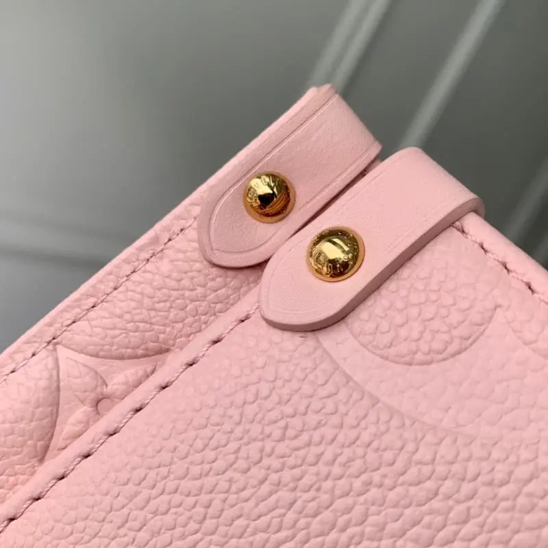 M45653 Pink This Onthego mini shopping bag shows the Monogram pattern to the fullest. The large letters are embossed on the soft grained cowhide. The ample interior can accommodate a laptop and other office supplies. The long and short handles are convenient for hand or shoulder carrying. Size: 25*19*11.5