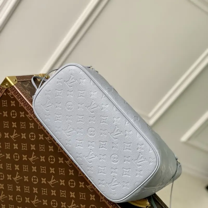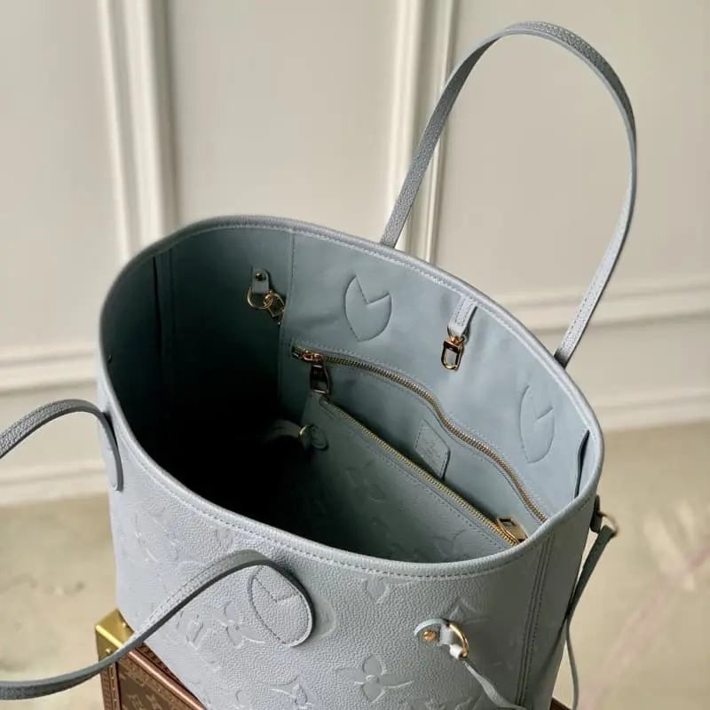 M45685 All-leather embossed blue Neverfull medium shopping bag! The redesigned inner bag features a fresh fabric lining and vintage details inspired by the archives. The most noteworthy is the detachable zipper clutch, which can be used as a delicate clutch or as an additional pocket. 32x29x17cm