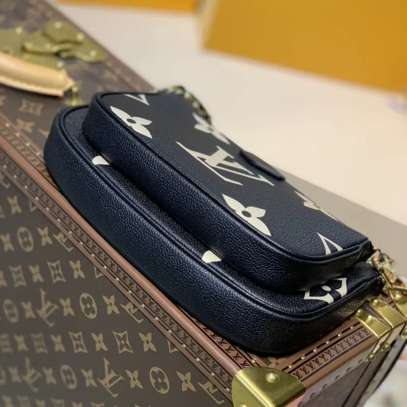 The M45777 black silk-screen Multi Pochette Accessories handbag is a three-in-one dynamic design made of Monogram canvas and is equipped with multiple pockets and compartments. The adjustable gold chain and Lbag jacquard shoulder strap provide multiple carrying methods such as crossbody. Dimensions: 24 x 13.5 x 4 cm