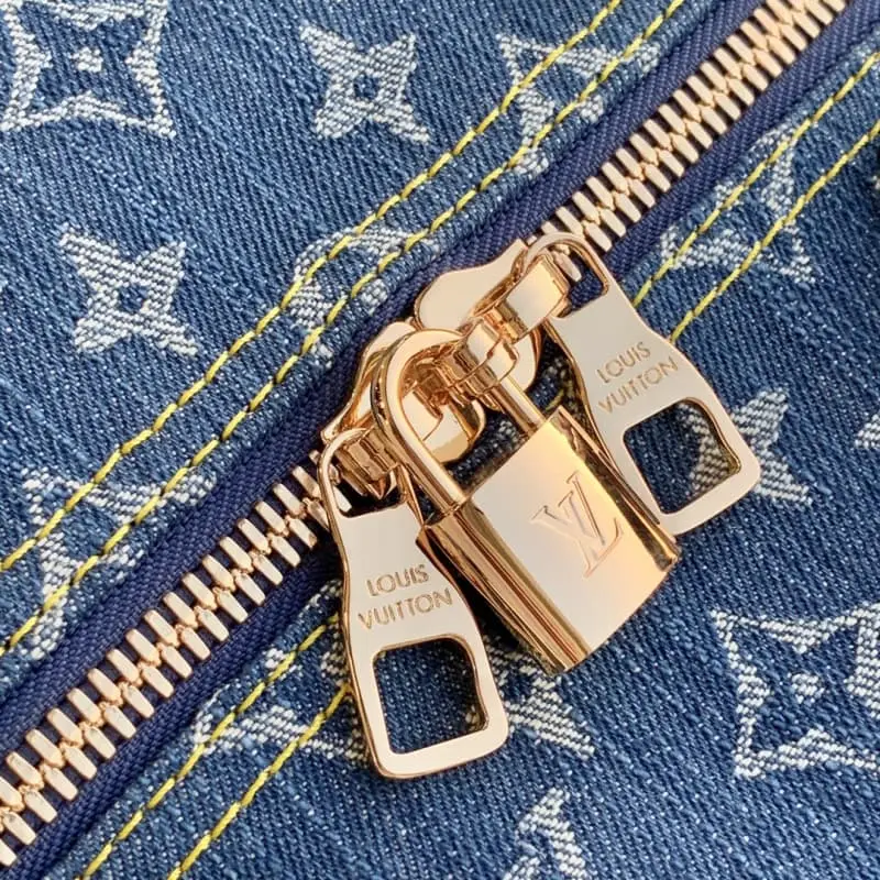 Original M45975 Blue (Denim) 2022 Spring/Summer Keepall travel bag updated with the Monogram Drip by Japanese streetwear designer Nigo. Classic pattern denim on fine grain Taurillon leather with a flowing look. Heart-shaped label adds a splash of colour. Cabin luggage dimensions with plenty of space. Dimensions 50.0 x 29.0 x 23.0 cm.