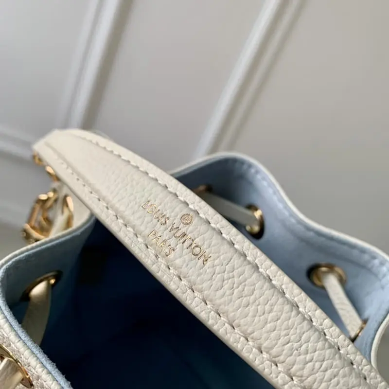 M46291 Blue Silkscreen Nano No?? Handbag The LV letters and Monogram flowers are first printed and then embossed on the leather to create an eye-catching look that confuses the eye. Ample space to accommodate daily needs. The adjustable shoulder strap and handles can be removed to achieve a variety of carrying methods. 13 x 16 x 10 cm (length x height x width)