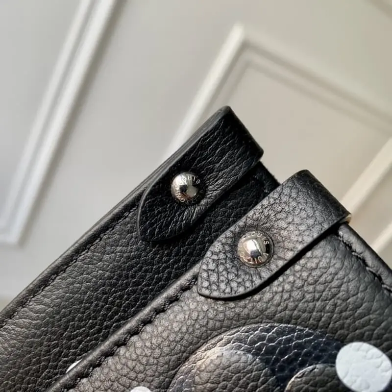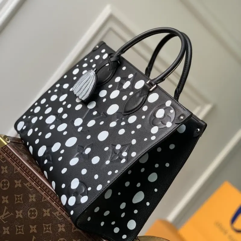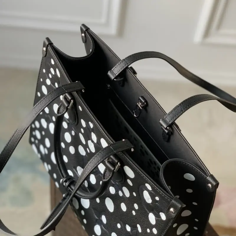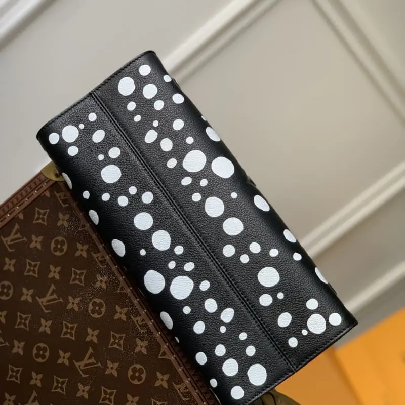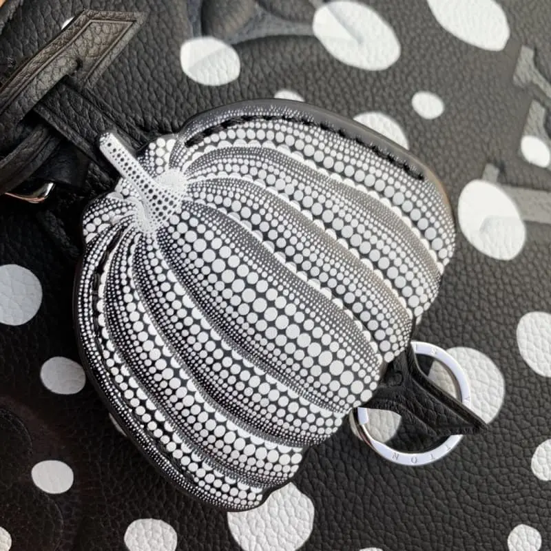 M46389 Gram LVxYK OnTheGo MM, Lbag x Yayoi Kusama’s major new collection, features the Japanese artist’s most recognisable signature: a repeating array of dots symbolising infinity. Dazzling white dots are printed on textured black cowhide leather embossed with one of the House’s own signatures, the iconic Monogram pattern. This spacious and practical tote features a pumpkin-shaped charm, another recurring theme in Kusama’s work. Dimensions: 35 x 27 x 14 cm
