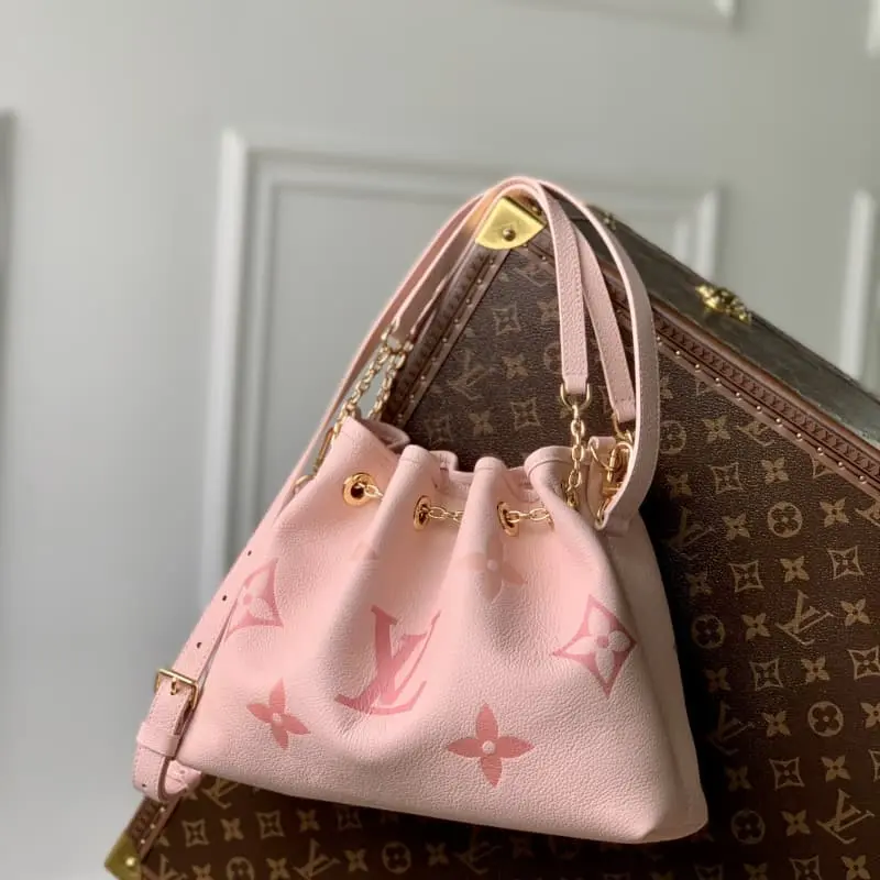M46492 Pink Silkscreen Summer Bundle Handbag from the D??grad?? series. The new drawstring design adds a summer vibe. The Monogram Empreinte embossed leather body presents gradient tones to brighten up any seasonal look. The double handles and detachable crossbody shoulder strap provide a variety of fashionable carrying methods to make it a good companion for day and night travel. 28.0 x 20.0 x 11.5 cm (length x height x width)