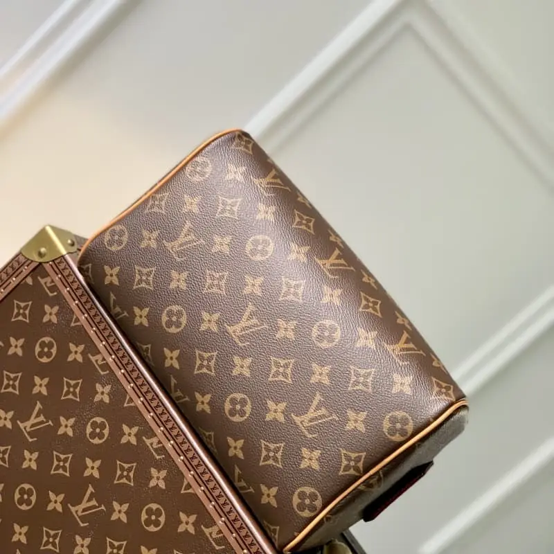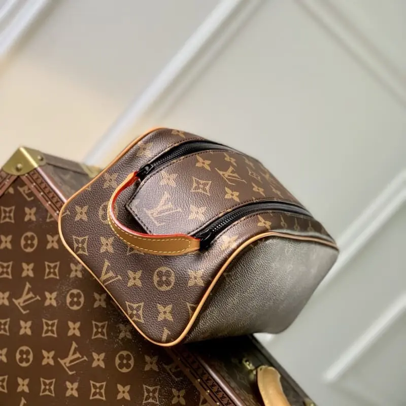 M46696 The Dopp Bag toiletry bag is made of Monogram Makassar coated canvas with cowhide trim and washable textile fabric. Hints of orange leather especially the handles bring a touch of modernity. The sturdy double zip opening and the handles can be used to hang on bathroom hooks making it practical. 28x15x16.5 cm (LxHxW)