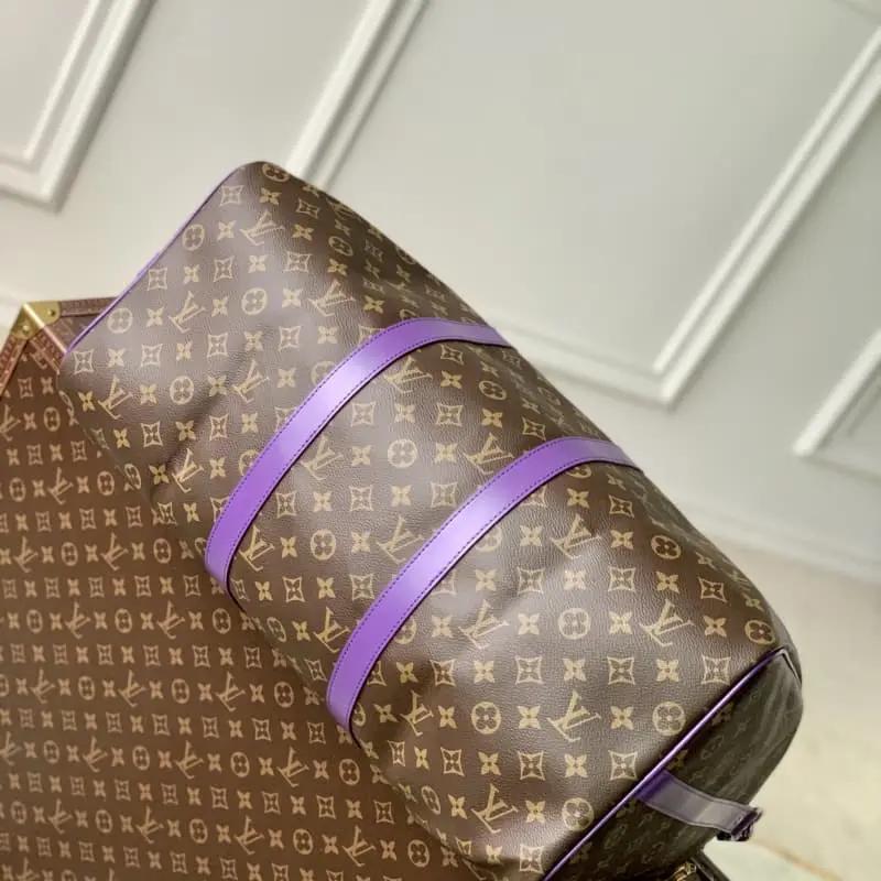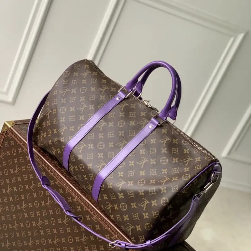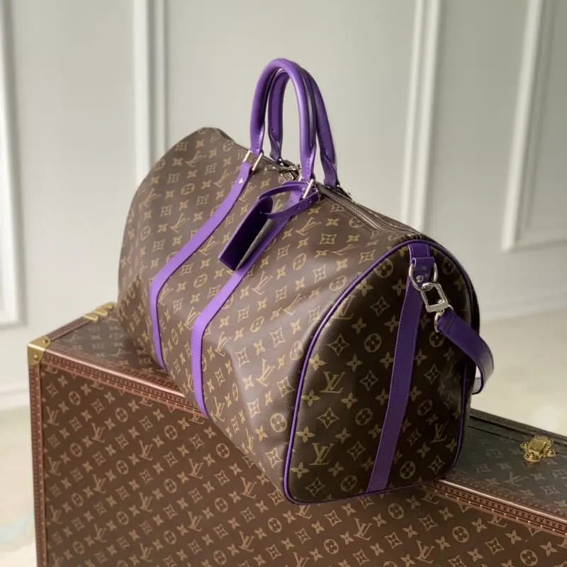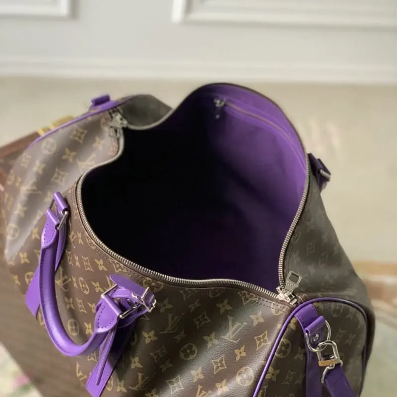 M46775 Purple This Keepall Bandouli??re 50 travel bag uses Monogram Macassar canvas to create a bright color for the side straps, name tag, fabric lining and top leather handle. The cabin luggage size hides ample space. 50.0 x 29.0 x 23.0 cm (L x H x W)