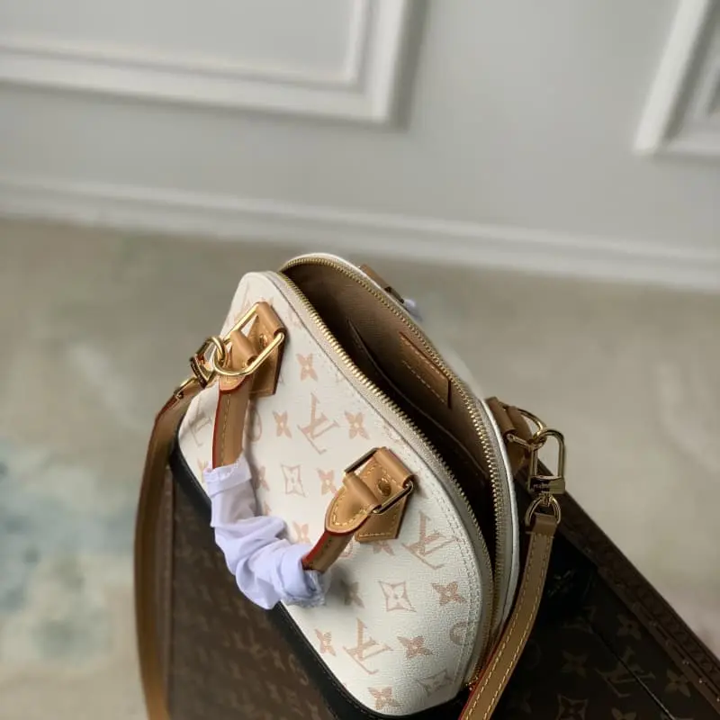 M46922 [53152 White Flower] The new monobloc canvas blends with the modern “Alma BB”. The cowhide trim makes the beige tone more prominent. The handle and strap are made of wood leather. The bottom of the bag and the keychain are made of black. 2 top handles and a detachable strap allow you to enjoy a variety of styles. 23.5 x 17.5 x 11.5 cm (length x height x width)