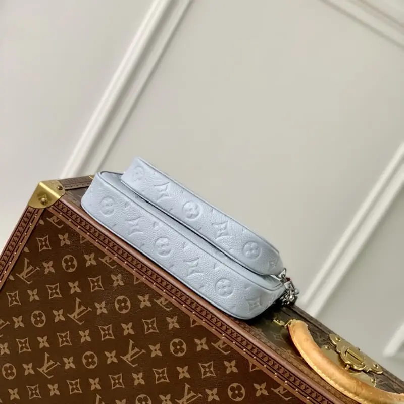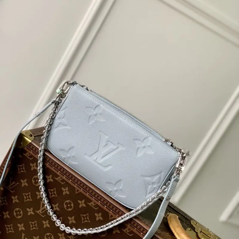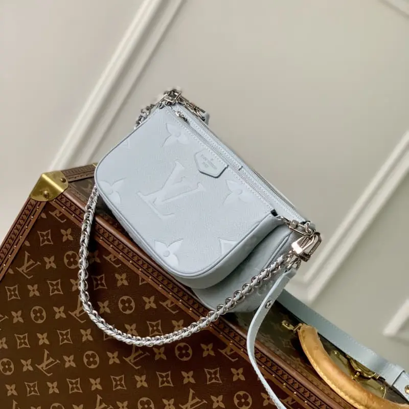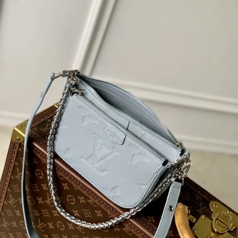 M47173 Blue M80399 This Multi Pochette Accessoires handbag is made of Monogram Empreinte leather and is a lightweight structure that cleverly combines independent large and small clutches. The former has an inner patch pocket that can easily accommodate daily needs. The chain and adjustable shoulder strap are both detachable and provide a variety of carrying options. 25 x 14.5 x 4.5 cm (length x height x width)