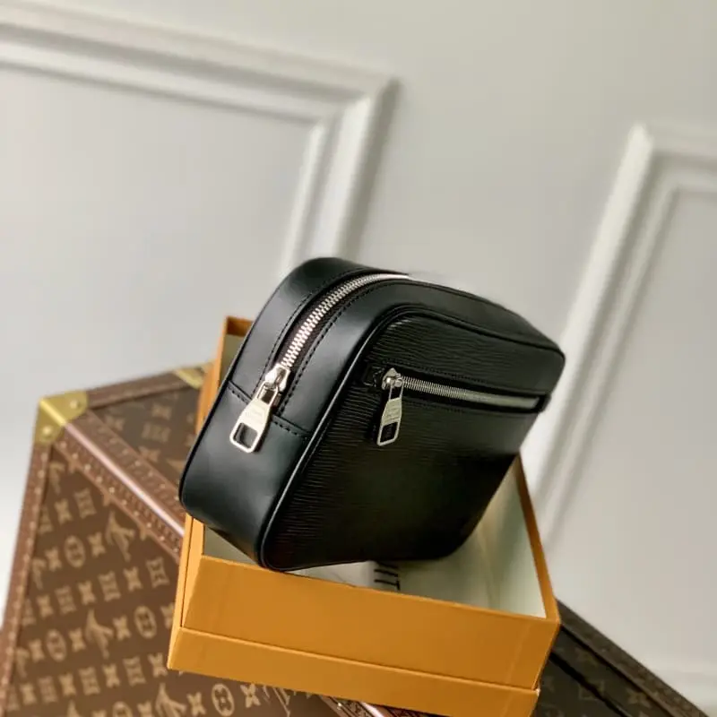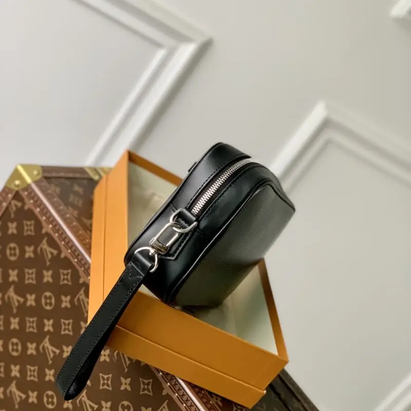 M51726 Water Ripple Black Pochette Kasai Clutch is made of fine Taga leather to create a compact structure and the LV letters are marked on the bottom corners. There are patch pockets and card slots inside to ensure that you can carry everything you need neatly. The leather wristband allows for multiple ways of carrying. Dimensions 25 x 15.5 x 6.5 cm (length x height x width)