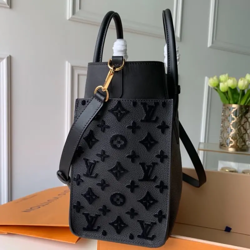 The M53826 black embroidered On My Side handbag is made of fine-grained calfskin and Nappa Softy leather with subtle Monogram tufting. The square design provides ample space to accommodate daily necessities. The two leather handles can be used for hand-carrying and the shoulder strap can be used for cross-body, which is ideal for daily travel. Dimensions: 30.5 x 24.5 x 14.0 cm