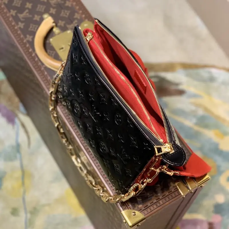 The M57793 patent leather black Coussin small handbag shines on the 2021 Spring/Summer fashion show. The Monogram embossed fluffy sheepskin creates a pillow configuration that injects avant-garde style into the simple design. It can be carried cross-body or transformed into a chain baguette bag using the shoulder strap. Detailed features 26 x 20 x 12 cm (length x height x width) Monogram embossed fluffy sheepskin Calfskin trim Microfiber lining Metal parts Inner compartment Zipper closure Shoulder strap: Removable Adjustable strap half length: 30.0 cm Strap half length can be adjusted to: 50.0 cm Chain: Removable chain half length: 27.0 cm