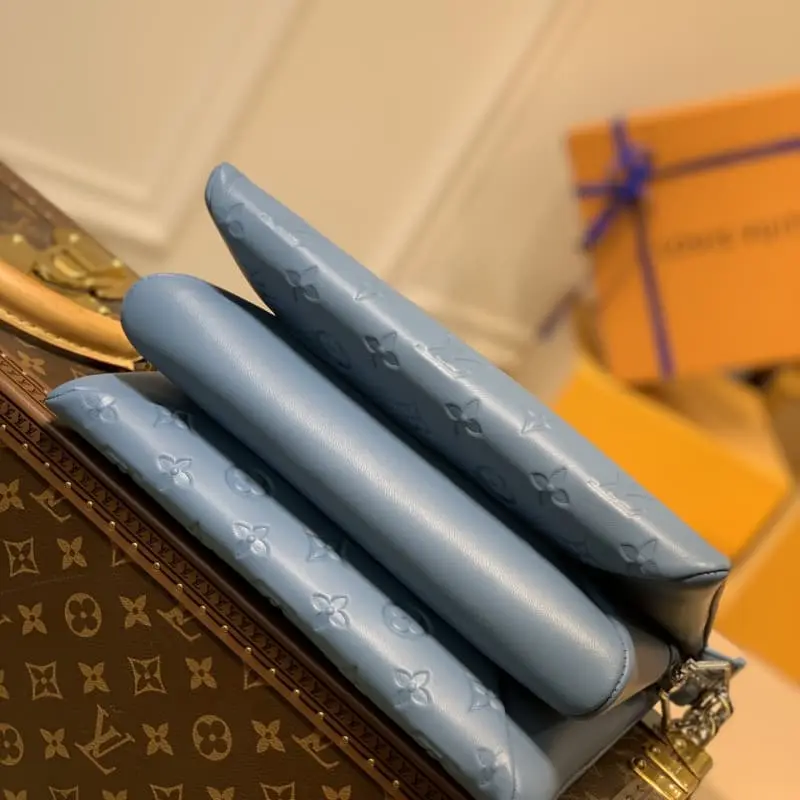The M57793 grey-blue Coussin Small Bag made a splash at the 2021 Spring/Summer fashion show. The Monogram embossed fluffy sheepskin cushion shape injects an avant-garde twist into the simple design. It can be carried cross-body or as a chain baguette with the shoulder strap, or carried under the arm. Detailed Features 26 x 20 x 12 cm (length x height x width) Monogram embossed fluffy sheepskin Calfskin trim Microfiber lining Metal parts Inner compartment Zipper closure Shoulder strap: detachable and adjustable strap half length: 30.0 cm Strap half length adjustable to: 50.0 cm Chain: detachable chain half length: 27.0 cm